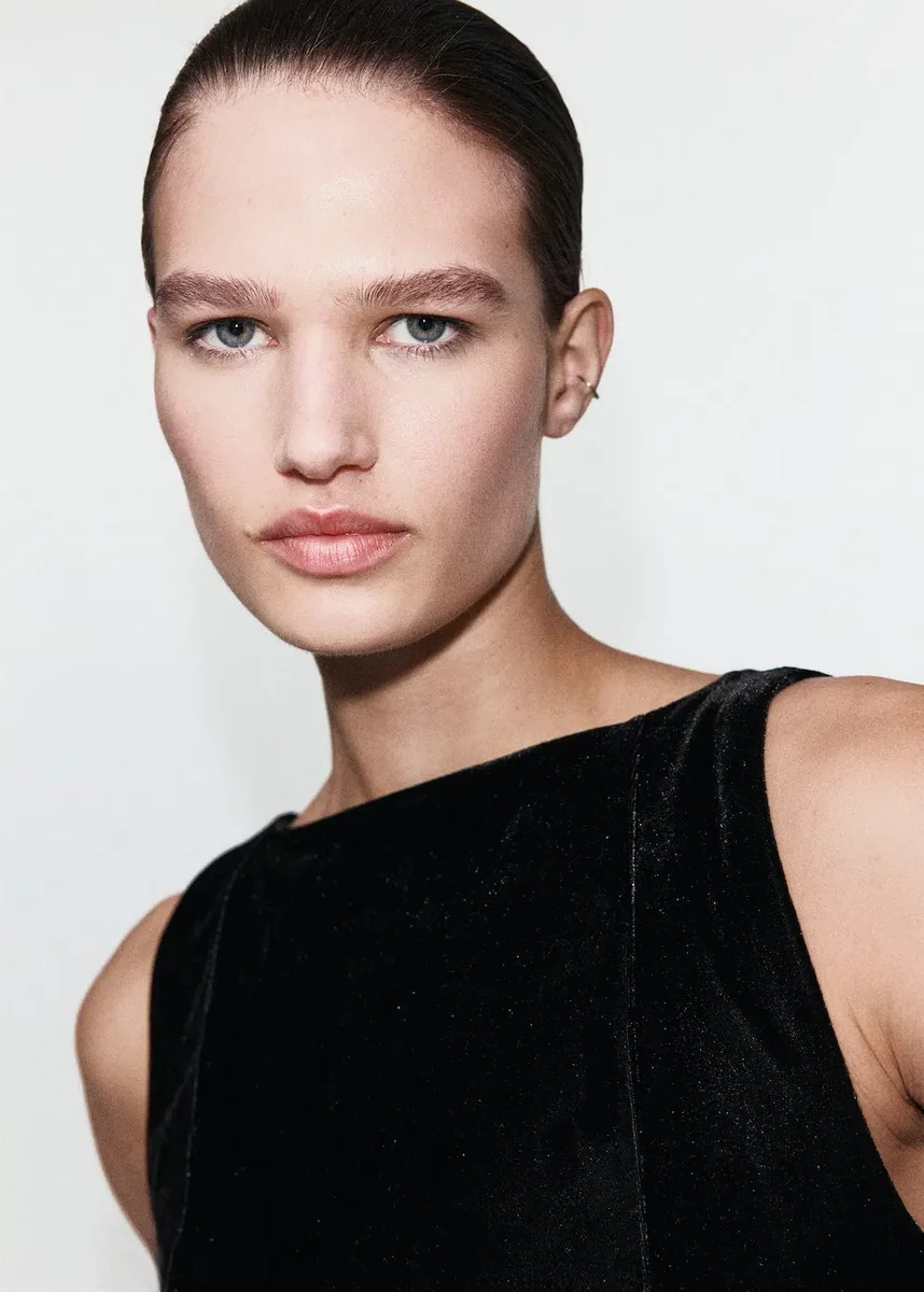 Sametová tkanina. Krátký střih. Přiléhavý střih. Lodní výstřih. Bez rukávů. Široké ramínka. Plná sukně. Bez zapínání. Tento oděv je součástí naší kolekce pro večírky a společenské události, která je navržena tak, aby podtrhla váš vzhled při zvláštních příležitostech.