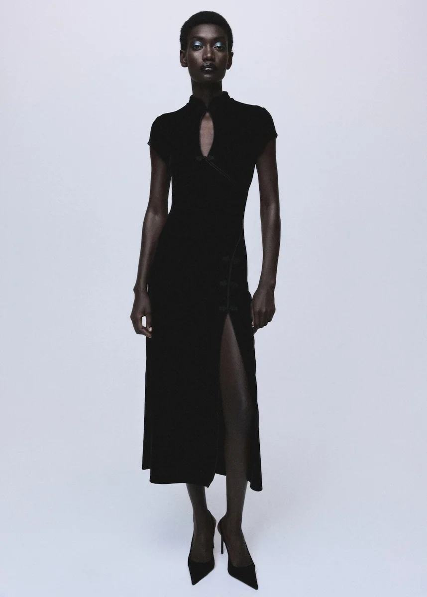 Sametová tkanina. Midi střih. Přiléhavý střih. Stojací límec. Krátké rukávy. Kruhový výstřih na hrudi. Boční rozparek na spodním lemu. Zapínání na knoflíky. Exkluzivně online. Tento model je součástí naší kolekce pro večírky a společenské události, která byla navržena tak, aby podtrhla váš vzhled při zvláštních příležitostech.