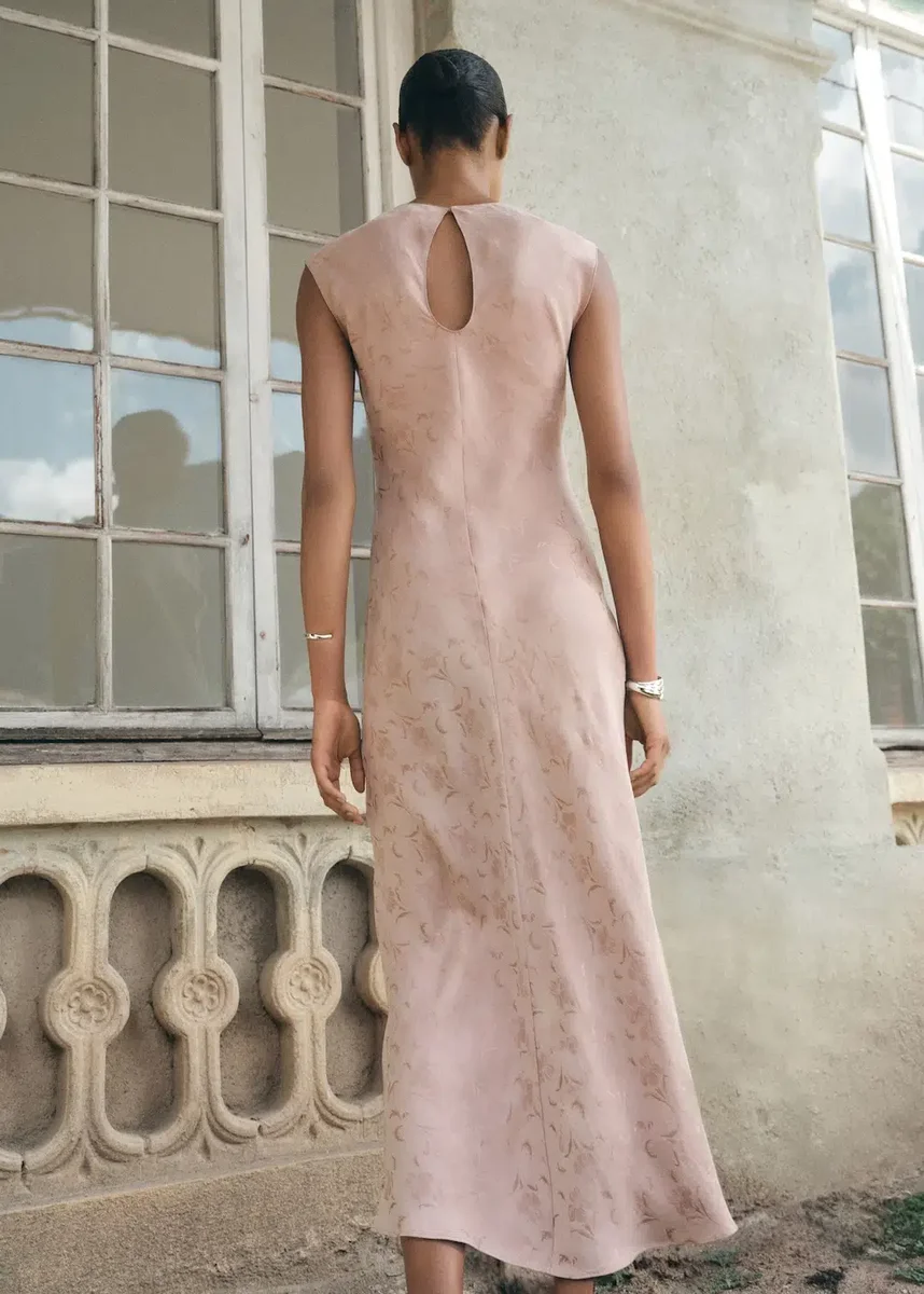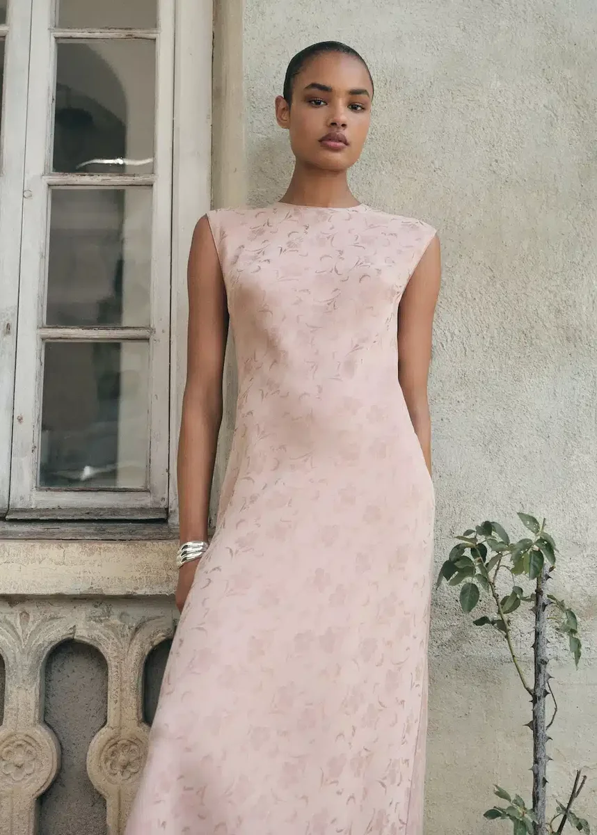 Saténová tkanina. Midi střih. Rovný střih. Kulatý výstřih. Krátké rukávy. Květinové detaily. Zapínání na knoflíky u krku. Růžová barva je exkluzivně k dostání online. Černý pátek