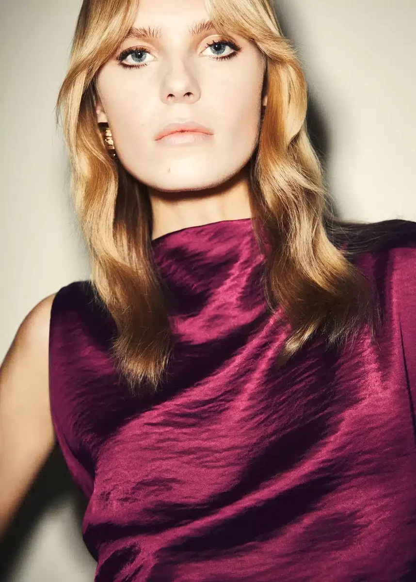 Saténová vazba. Zmačkaný efekt. Krátký střih. Přiléhavý střih. Kulatý výstřih. Asymetrické rukávy. Boční volány. Zapínání na knoflíky u krku. K dispozici v nadměrných velikostech. Tento oděv je součástí naší kolekce pro večírky a akce, která byla navržena tak, aby podtrhla váš vzhled při zvláštních příležitostech.