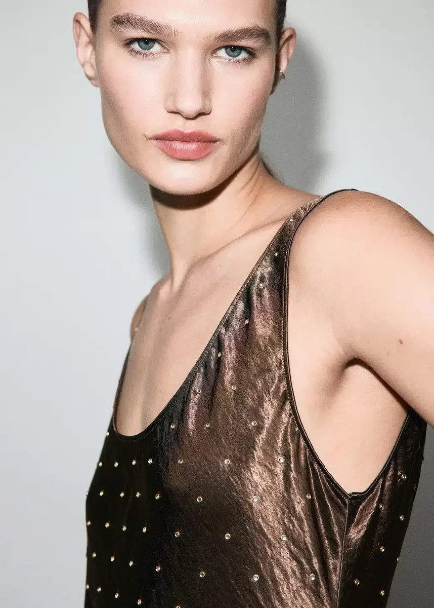 Saténová vazba. Zmačkaný efekt. Dlouhý střih. Rovný střih. Krystalové ozdoby. Hluboký výstřih. Bez rukávů. Široká ramínka. Bez zapínání. Tento model je součástí naší kolekce pro večírky a slavnostní příležitosti, která vám pomůže zazářit při zvláštních příležitostech.