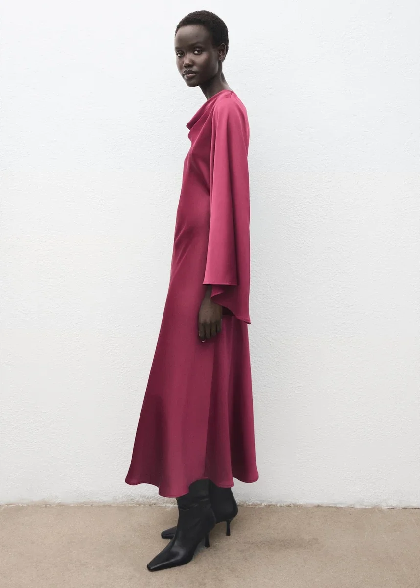 Saténová vazba. Midi střih. Střih do A. Drapovaný výstřih. Rozšířené rukávy. Boční zapínání na zip. Tento oděv je součástí naší kolekce pro zvláštní příležitosti, která je navržena tak, abyste byla dokonalým hostem na jakékoli párty, svatbě nebo slavnosti. Exkluzivně online