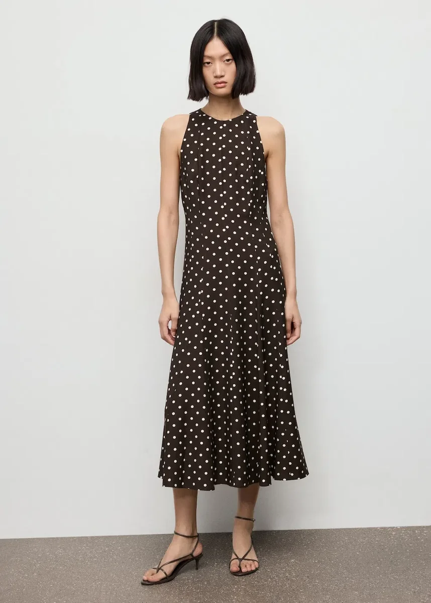 Puntíkový vzor. Střih midi. Střih do A. Kulatý výstřih. Bez rukávů. Široké ramínka. Zapínání na zip vzadu. Vnitřní podšívka. Black Friday