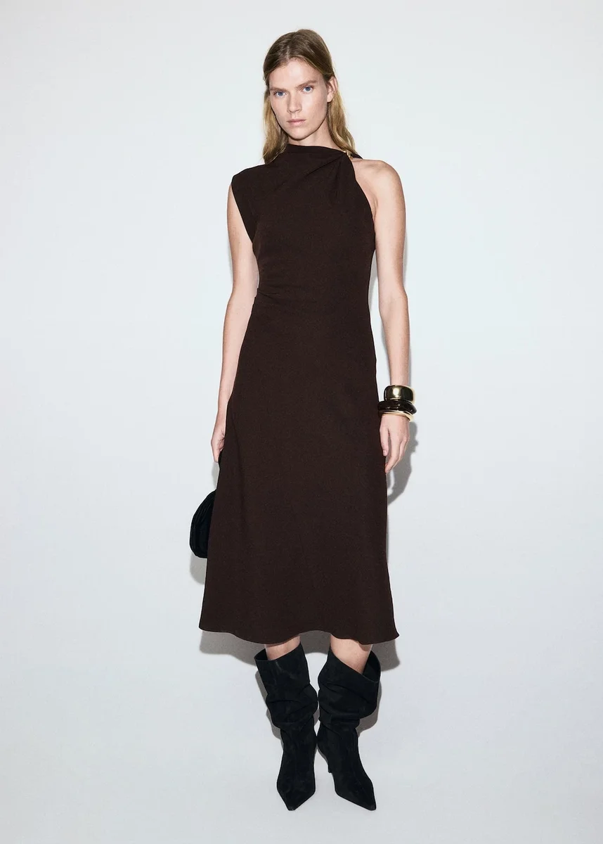 Střih midi. Střih do A. Kulatý výstřih. Asymetrické rukávy. Kovový detail na ramínku. Boční volány. Zapínání na zip vzadu. Vnitřní podšívka. Tento oděv je součástí naší kolekce pro večírky a společenské události, která byla navržena tak, aby podtrhla váš vzhled při zvláštních příležitostech.