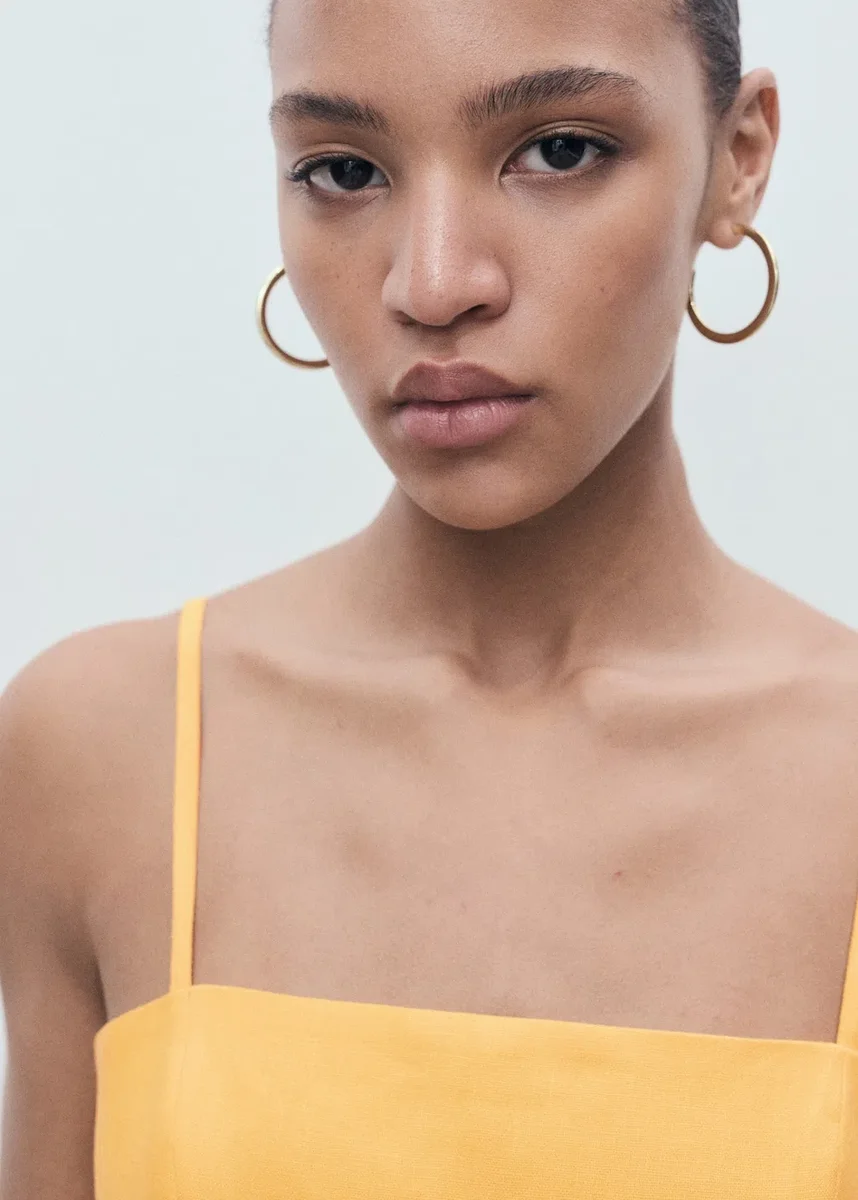100% lněná tkanina. Dlouhý střih. Střih do A. Hluboký výstřih. Bez rukávů. Tenká ramínka. Mašle v pase. Boční zapínání na zip. Podšívka ze 100% bavlny. Oranžová barva je exkluzivně k dostání online. Tento oděv je součástí naší kolekce pro volný čas, která je navržena tak, aby vás stylově doprovázela ve vašem každodenním životě.
