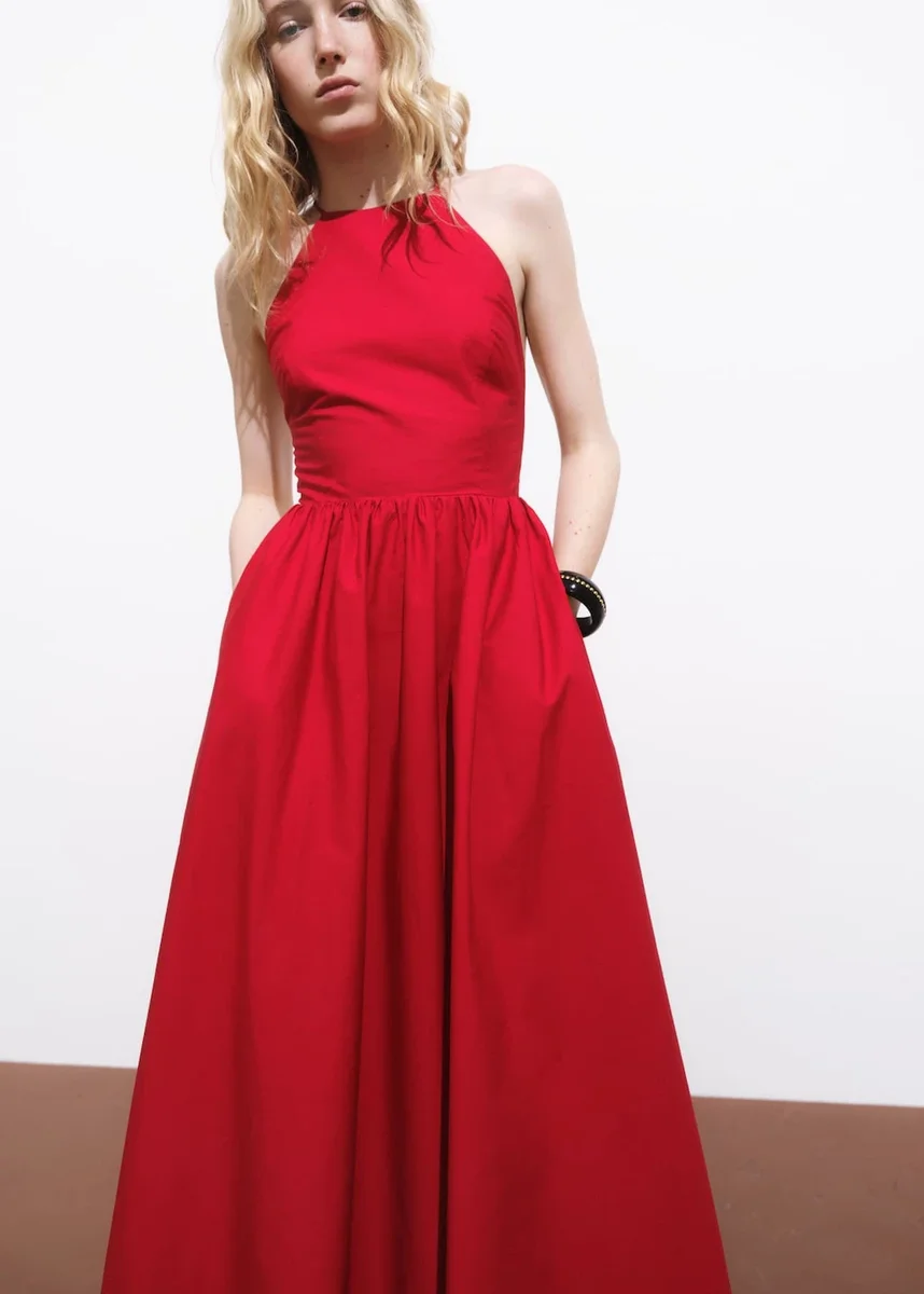 100% bavlna. Dlouhý střih. Střih do A. Halter výstřih. Bez rukávů. Otevřená záda. Zapínání na uzel vzadu.
