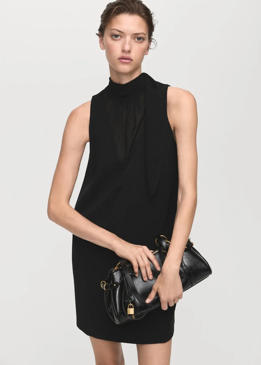 Krátký střih. Rovný střih. Stojací límec. Bez rukávů. Široké ramínka. Poloprůhledný panel. Mašle na zavázání u krku