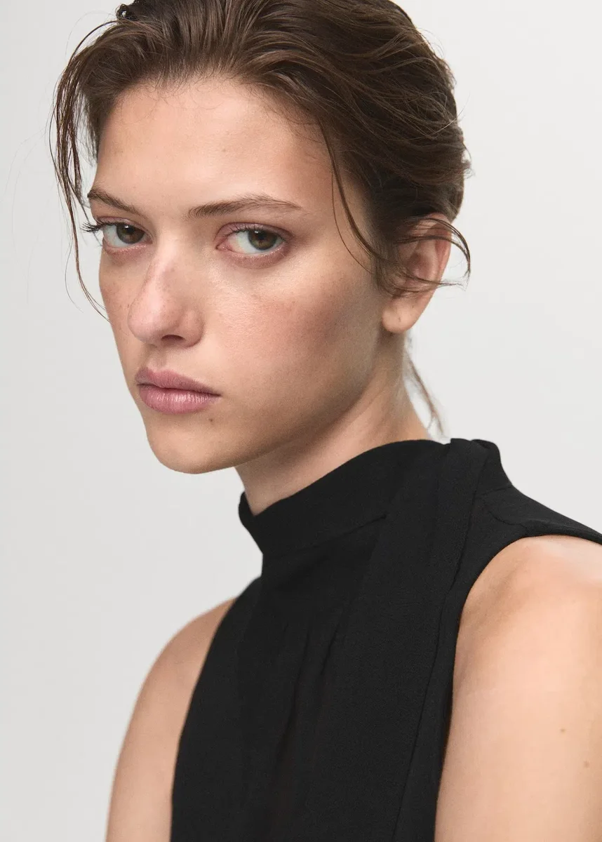 Krátký střih. Rovný střih. Stojací límec. Bez rukávů. Široké ramínka. Poloprůhledný panel. Mašle na zavázání u krku.