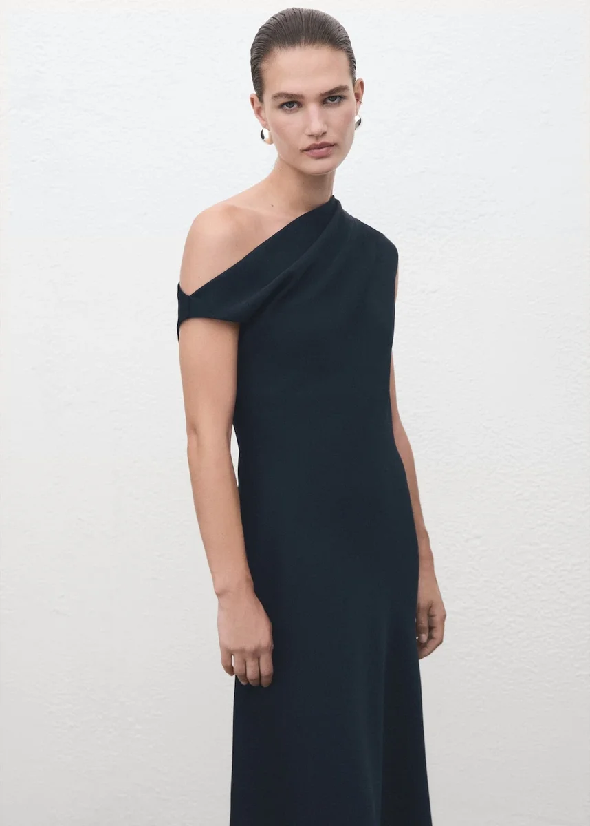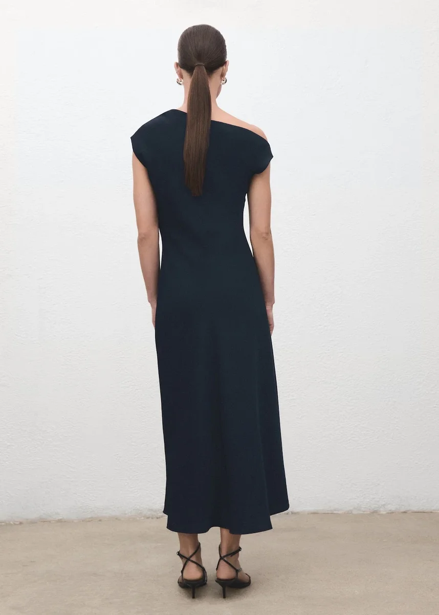 Střih midi. Střih do A. Asymetrický výstřih. Bez rukávů. Zapínání na zip na boku. K dispozici ve velikostech Plus.