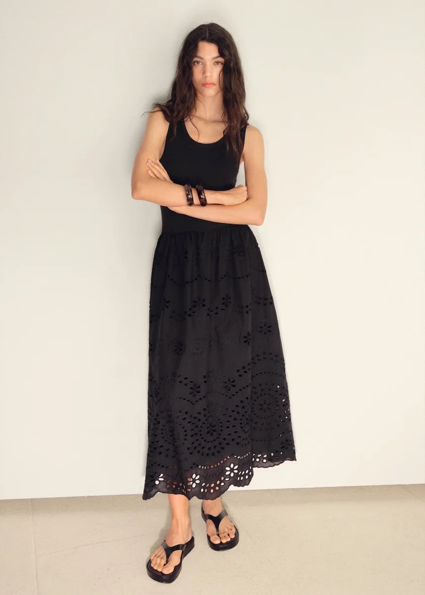 Bavlněná tkanina. Dlouhý střih. Střih do A. Kulatý výstřih. Bez rukávů. Široké ramínka. Sukně s vyšívanými a vyřezávanými detaily. Bez zapínání. Tento oděv je součástí naší kolekce pro volný čas, která je navržena tak, aby vás stylově doprovázela ve vašem každodenním životě.