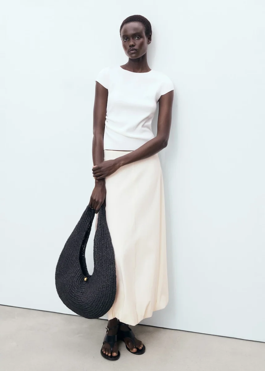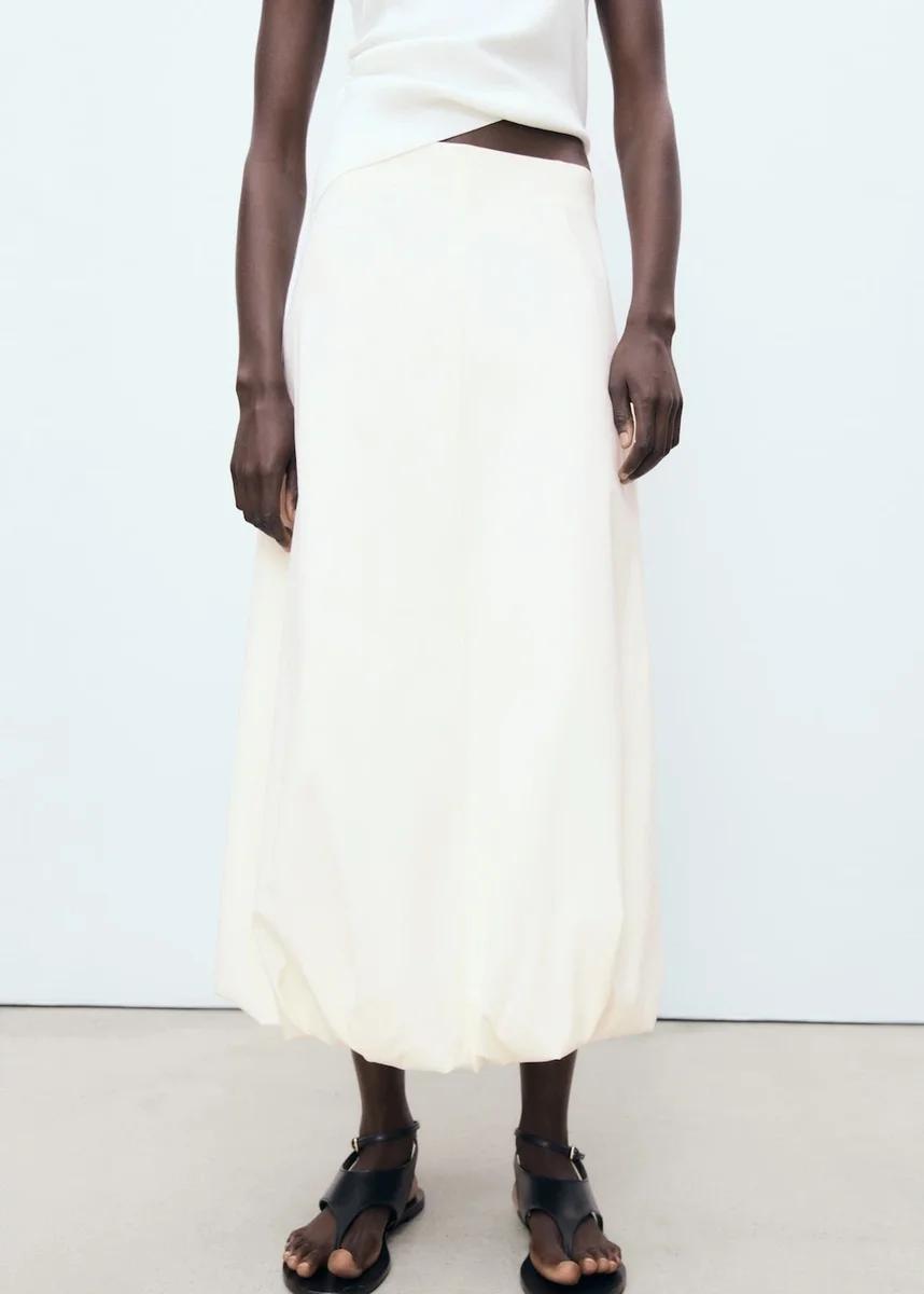 Bublinový lem. Dlouhý střih. Rovný střih. Středně vysoký pas. Bublinový lem. Zapínání na háčky a zip.