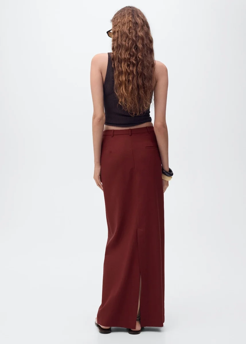Tato dlouhá sukně má rovný střih a vysoký pas. Díky svému úzkému střihu a rozparku na zadní straně působí velmi elegantně.
