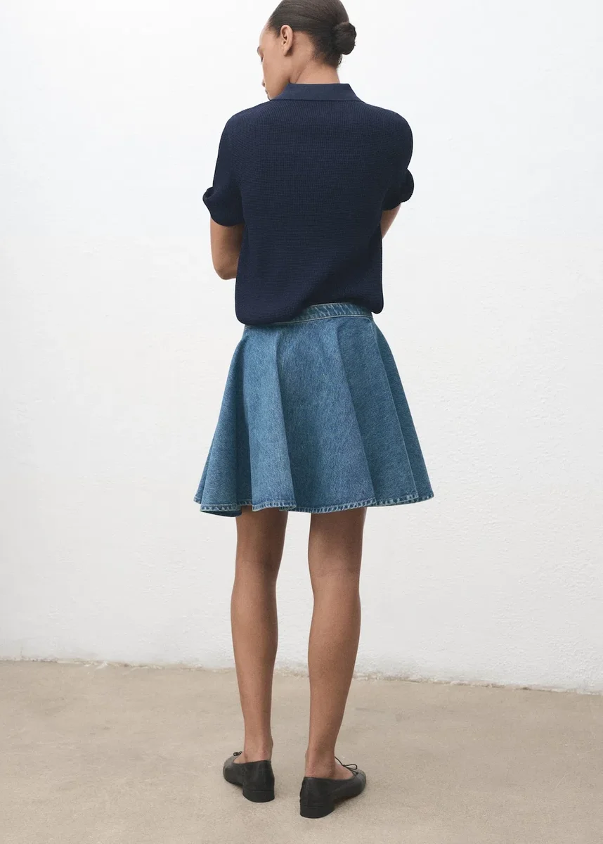 Tato sukně je vyrobena z bavlněné látky v denimovém stylu a má krátký střih se středně vysokým pasem. Zapínání na zip vzadu zajišťuje pohodlné a praktické nošení.