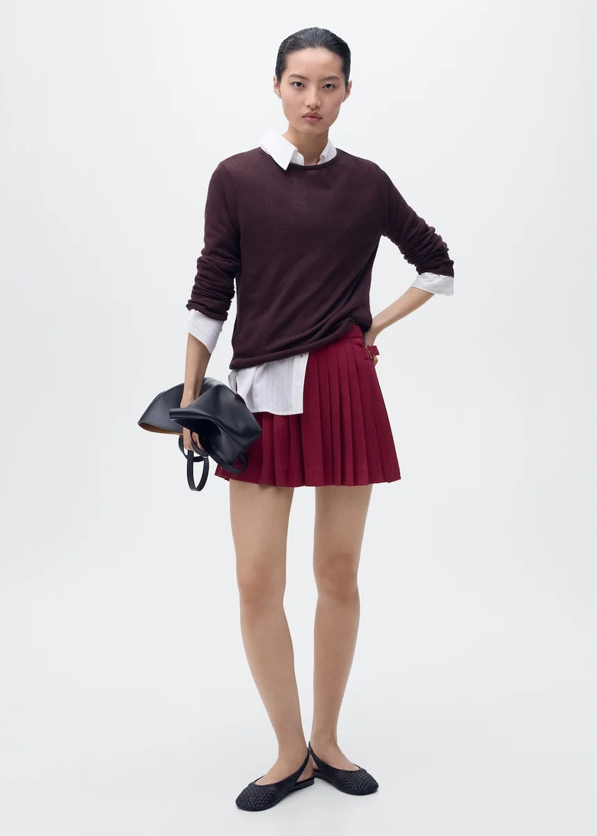 Tento krátký plisovaný model má středně vysoký pas a je doplněn ozdobnými přezkami.