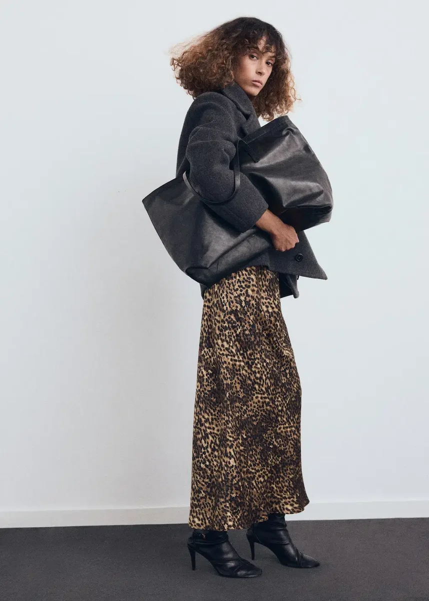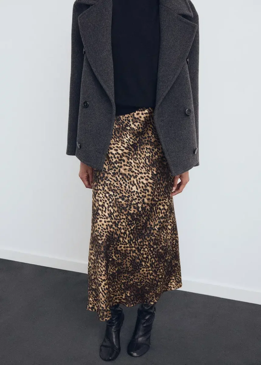 Tato sukně je vyrobena ze saténové tkaniny a zdobí ji leopardí potisk. Midi délka a rovný střih jsou doplněny středně vysokým pasem a elastickým lemem pro větší pohodlí. Součástí je i ladící halenka.