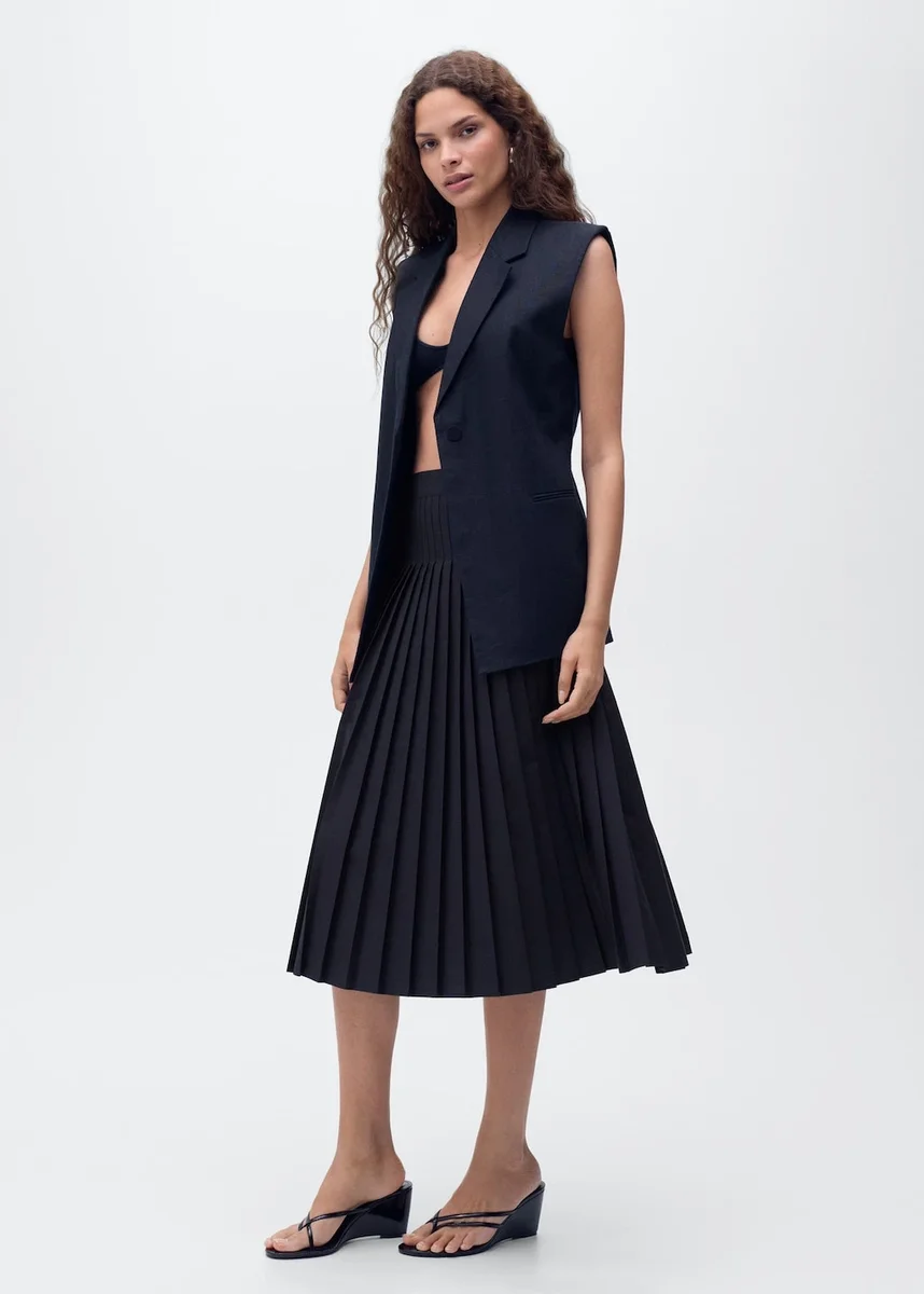 Tento model s midi délkou a rozšiřujícím se střihem zdobí elegantní plisování, které mu dodává pohyb.