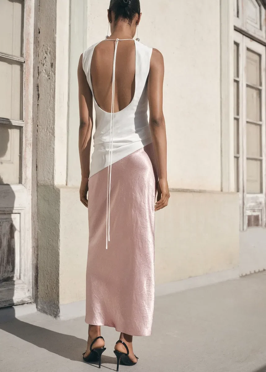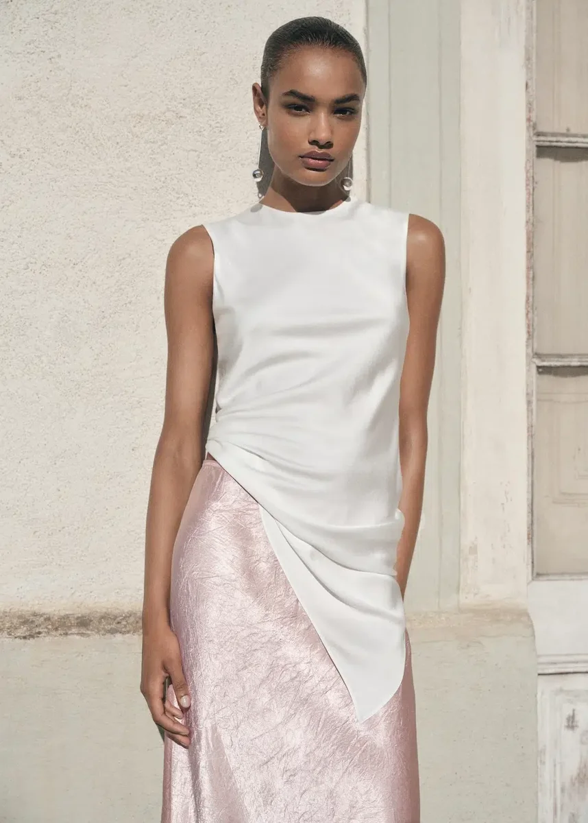 Tato sukně je ušita z nařaseného saténu a má midi délku a rovný střih. Středně vysoký a elastický pas zajišťuje pohodlí. Součástí je i ladící halenka pro dokonalý celkový vzhled. K dispozici v nadměrných velikostech