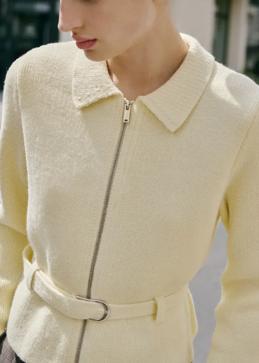 Směsová vlna. Středně silná pletenina. Rovný střih. Košilový límec. Dlouhé rukávy. Poutka na pásek. Zapínání na přezku. Zapínání na zip.