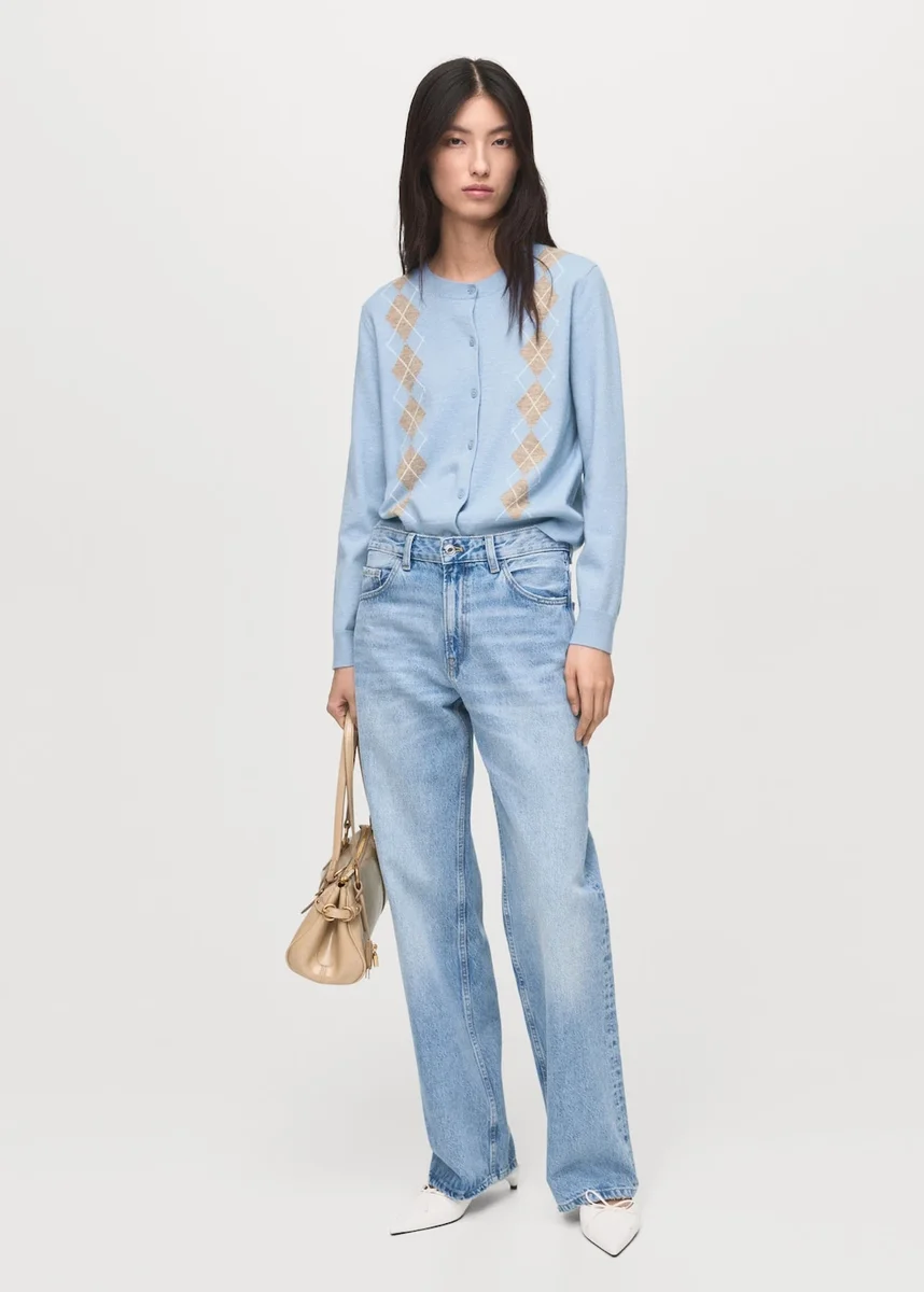 Tento rovný model z jemné pleteniny má kosočtvercový vzor. Má kulatý výstřih a dlouhé rukávy, zapínání na knoflíky vpředu. K dispozici v nadměrných velikostech