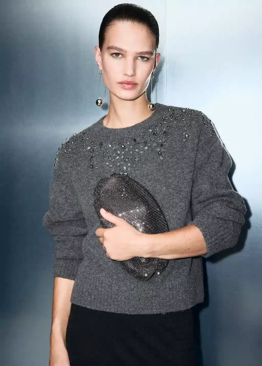 Tento rovný model z hrubého úpletu má hranatý výstřih a dlouhé rukávy. Dekorativní krystaly mu dodávají osobitý vzhled.