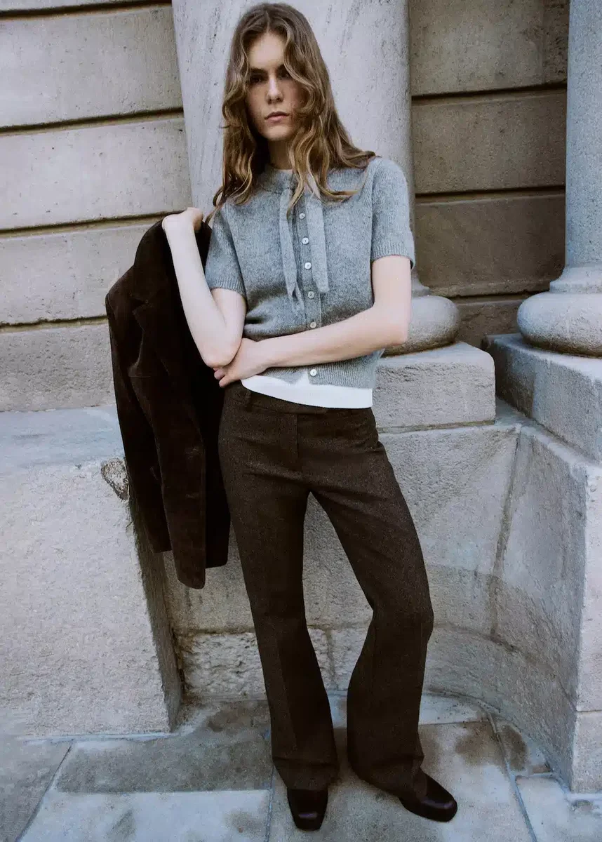 Tento rovný model z pletené látky má kulatý výstřih s mašlí. Krátké rukávy a zapínání na knoflíky vpředu dotvářejí jeho styl. Tento produkt je k dispozici pouze online