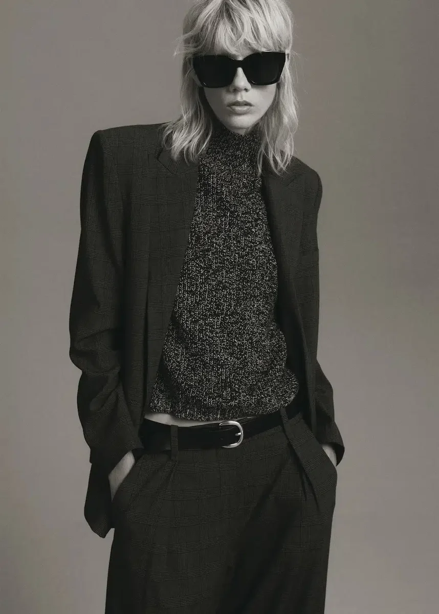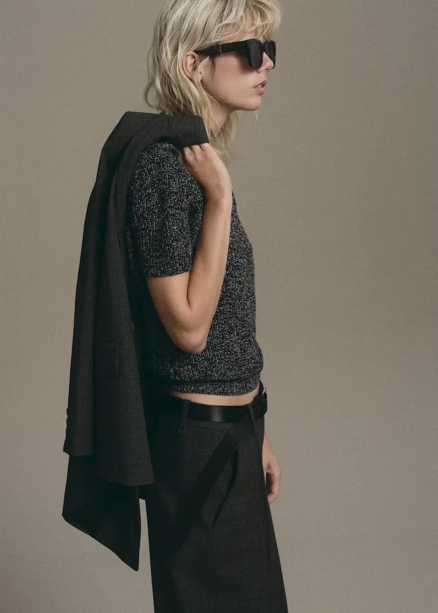 Melírovaná pletenina. Rovný střih. Rolákový výstřih. Krátké rukávy