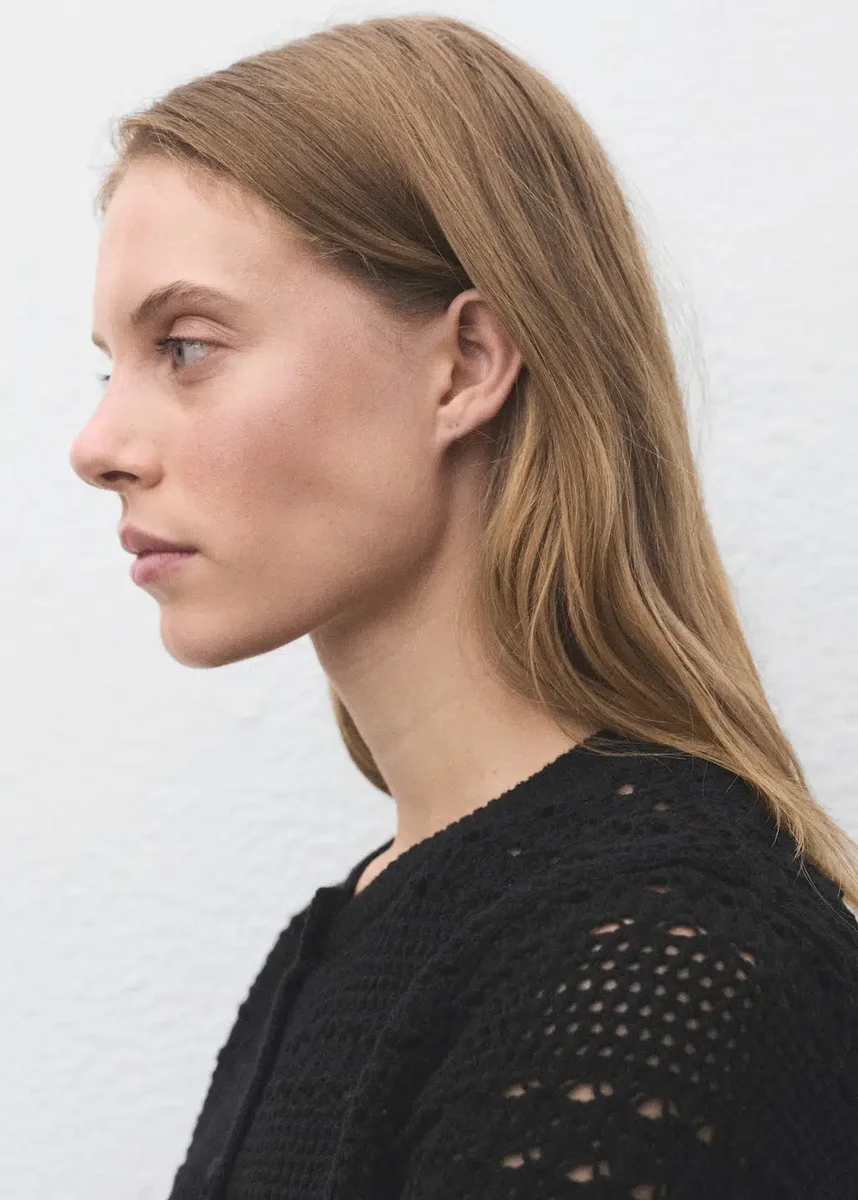 Tento kousek je vyroben z pletené látky s háčkovaným vzorem a má rovný střih s kulatým výstřihem a krátkými rukávy. Vpředu se zapíná na knoflíky. Celkový look doplňte ladícími šortkami.