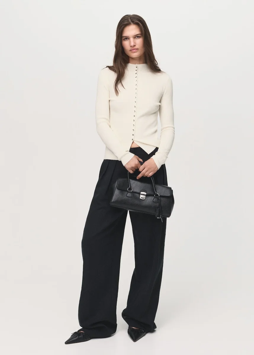 Tento svetr je vyroben z vlněné směsi a má jemný úplet s žebrováním. Jeho střih na míru doplňuje kulatý výstřih a dlouhé rukávy. Zapínání na knoflíky vpředu přidává funkčnost