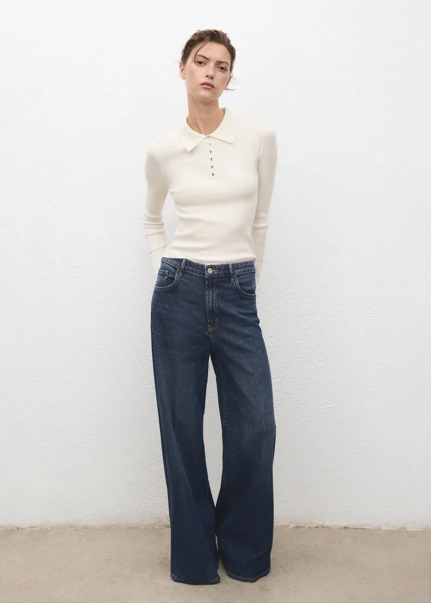 Tento svetr je vyroben z vlněné směsi a má jemný úplet s žebrováním. Jeho střih na míru doplňuje rolák s knoflíkovým zapínáním a dlouhé rukávy.
