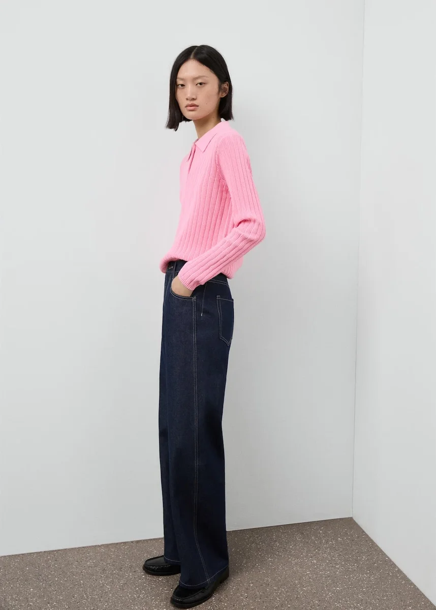Středně silná pletenina. Žebrovaná pletenina. Rovný střih. Rolák. Dlouhé rukávy. Zapínání na knoflíky u krku