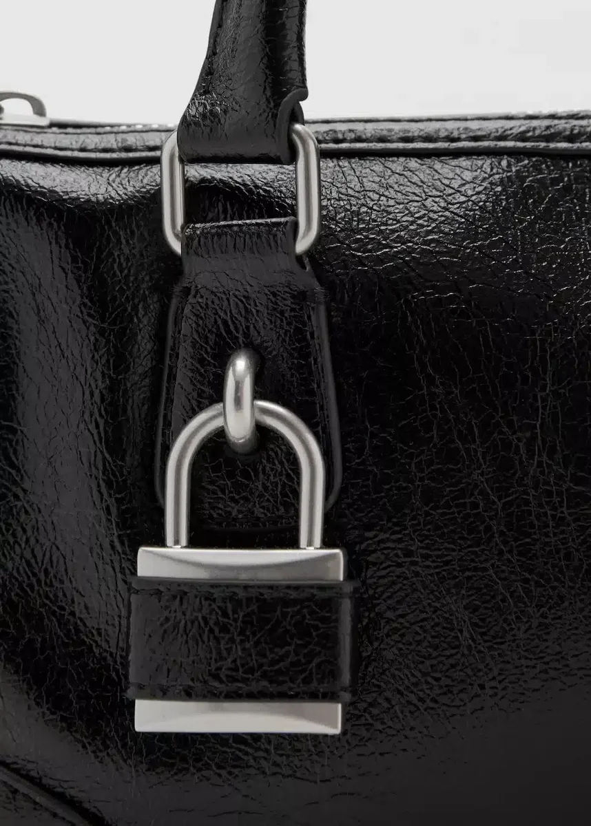 Kožený efekt. Lesklý povrch. Malá velikost. Obdélníkový design. Dvě krátká ucha. Odnímatelný dlouhý popruh přes rameno. Zapínání na zip. Detail visacího zámku. Vnitřní podšívka.