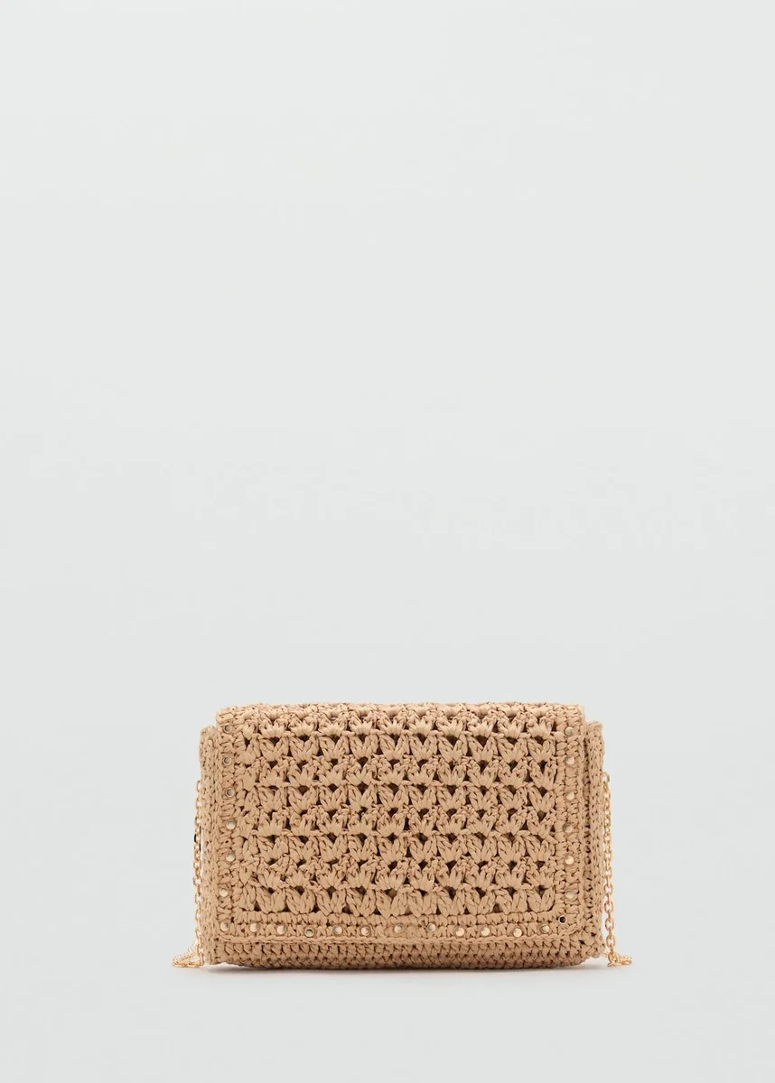 Malá velikost. Přírodní vlákna. Dlouhý odnímatelný řetízkový popruh. Cvočky. Vnitřní kapsa. Uzávěr s magnetickým knoflíkem. Vnitřní podšívka. 22 x 17 x 6 cm (délka x výška x šířka)