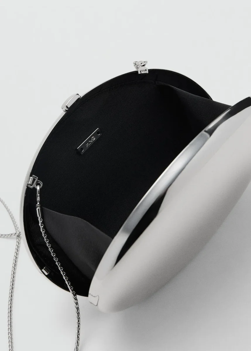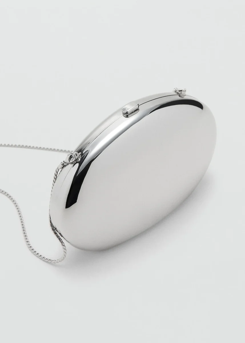 Metalický design. Oválný tvar. Styl psaníčka. Dlouhý odnímatelný řetízkový popruh. Kovové zapínání na patent. Vnitřní podšívka