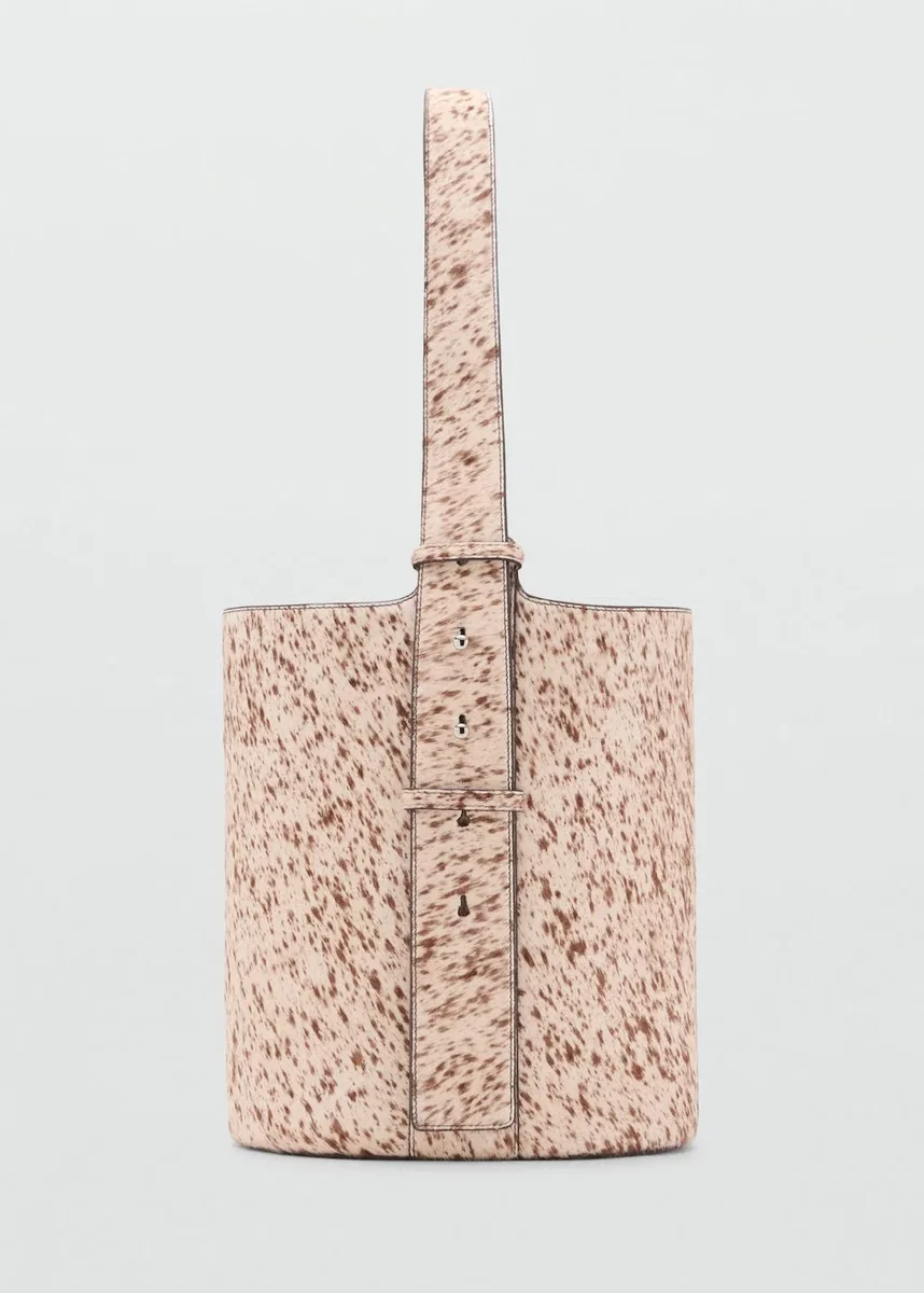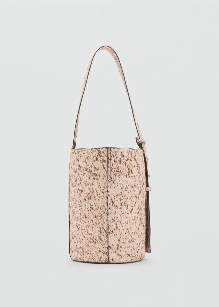 100% hovězí kůže s chlupy. Design ve tvaru kbelíku. Nastavitelný ramenní popruh. Malá vnitřní taška. Bez zapínání. Podšívka ze 100% bavlny.