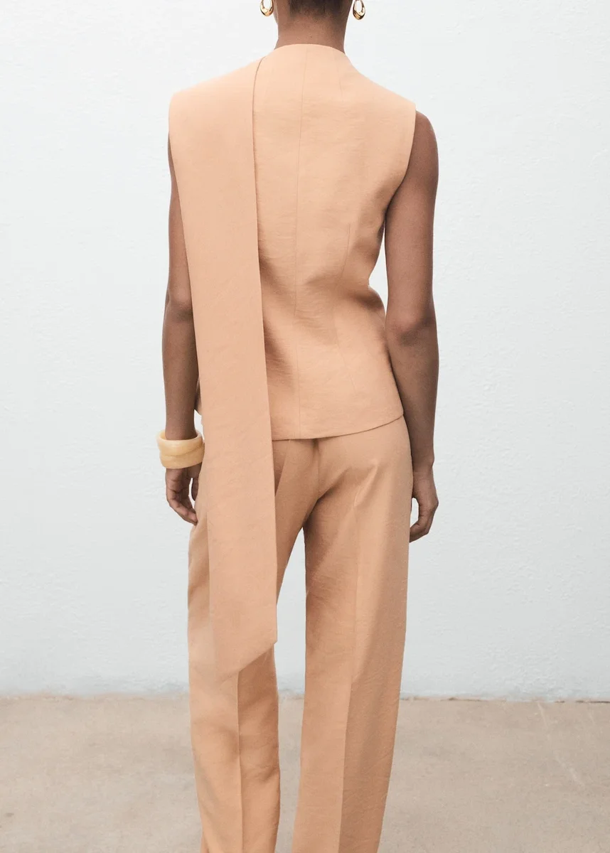 Tento top je vyroben z lyocellové tkaniny a má asymetrický design s bezrukávovými průramky. Kulatý výstřih je zdobený šátkem. Součástí je i ladící kalhoty pro ještě elegantnější vzhled.