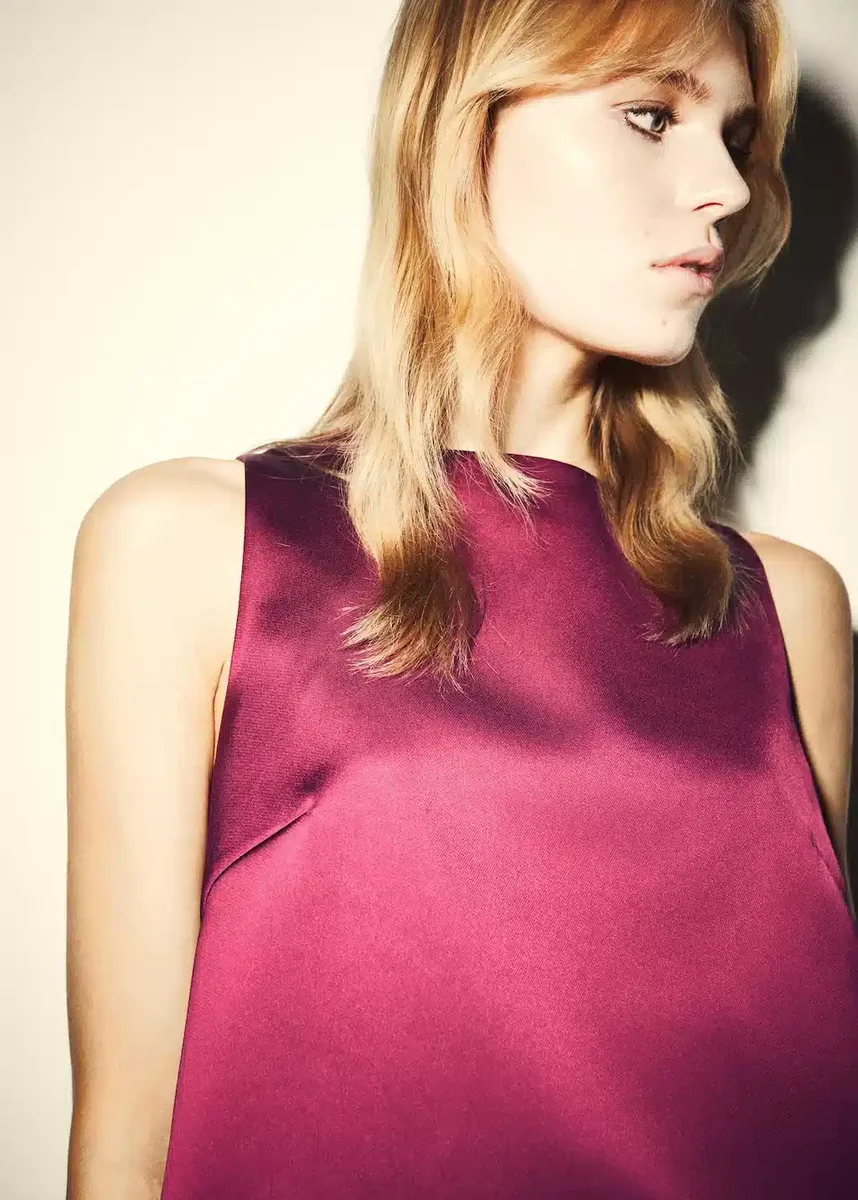 Tento krátký top ze saténové tkaniny má rovný střih a široká ramínka. Zavazování na zadní straně mu dodává zvláštní nádech. Dodává se s ladící sukní. Červený model je exkluzivně k dostání online.