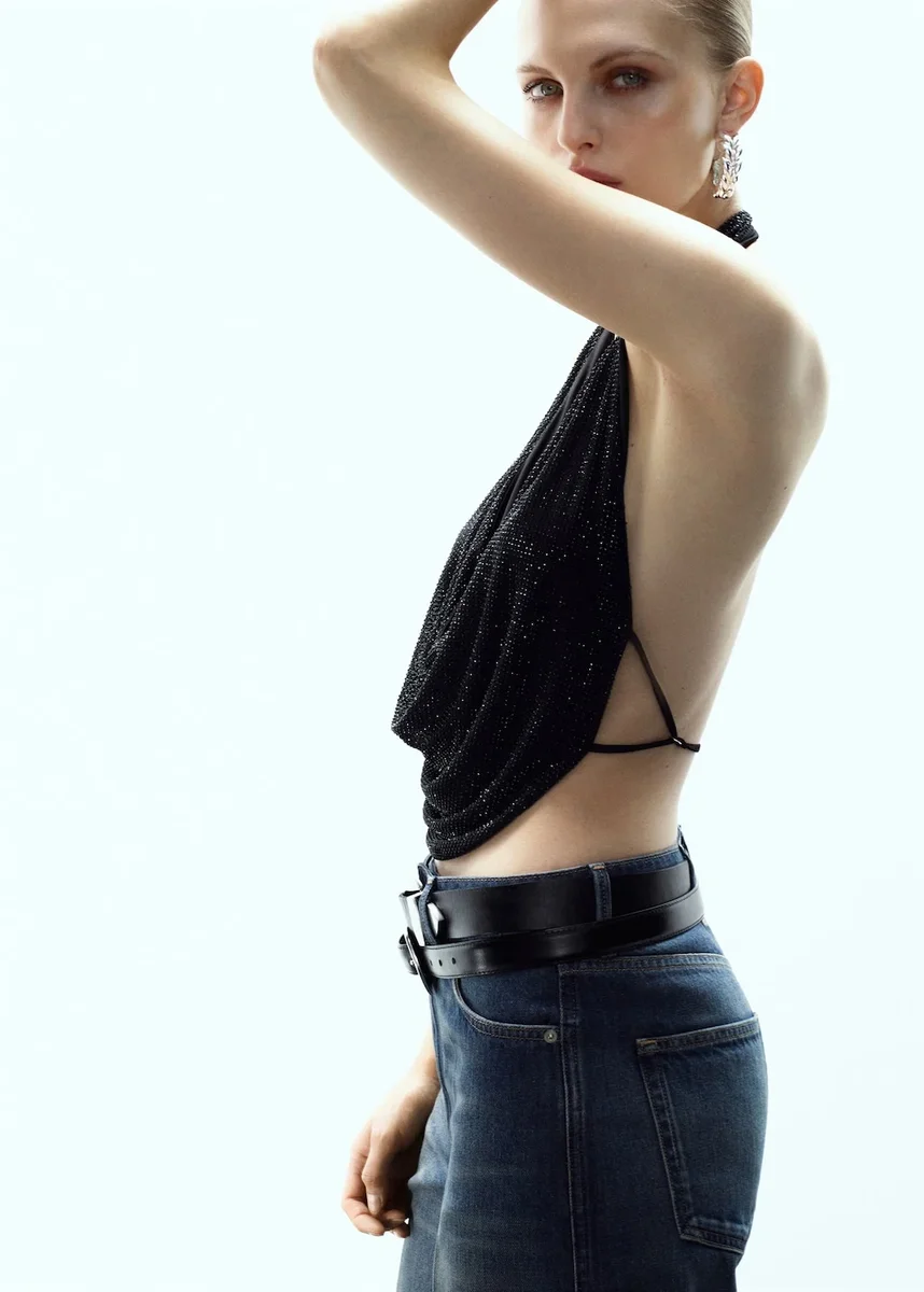 Tento top s krystalovou látkou má drapovaný výstřih s tenkými ramínky a otevřená záda s ramínkem. Tento oděv je součástí naší kolekce Selection, která byla navržena tak, aby pozvedla váš vzhled na nadcházejících večírcích a akcích.