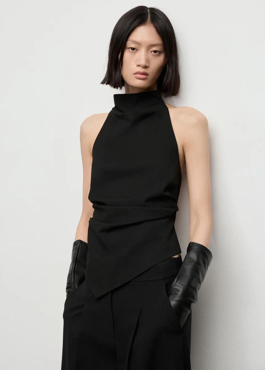 Rovný střih. Halter výstřih. Drapovaný výstřih. Bez rukávů. Otevřená záda s ramínky. Asymetrický lem. Zapínání na knoflíky u krku. Tento kousek je součástí naší kolekce pro večírky a společenské události, která je navržena tak, aby pozvedla váš vzhled pro zvláštní příležitosti.