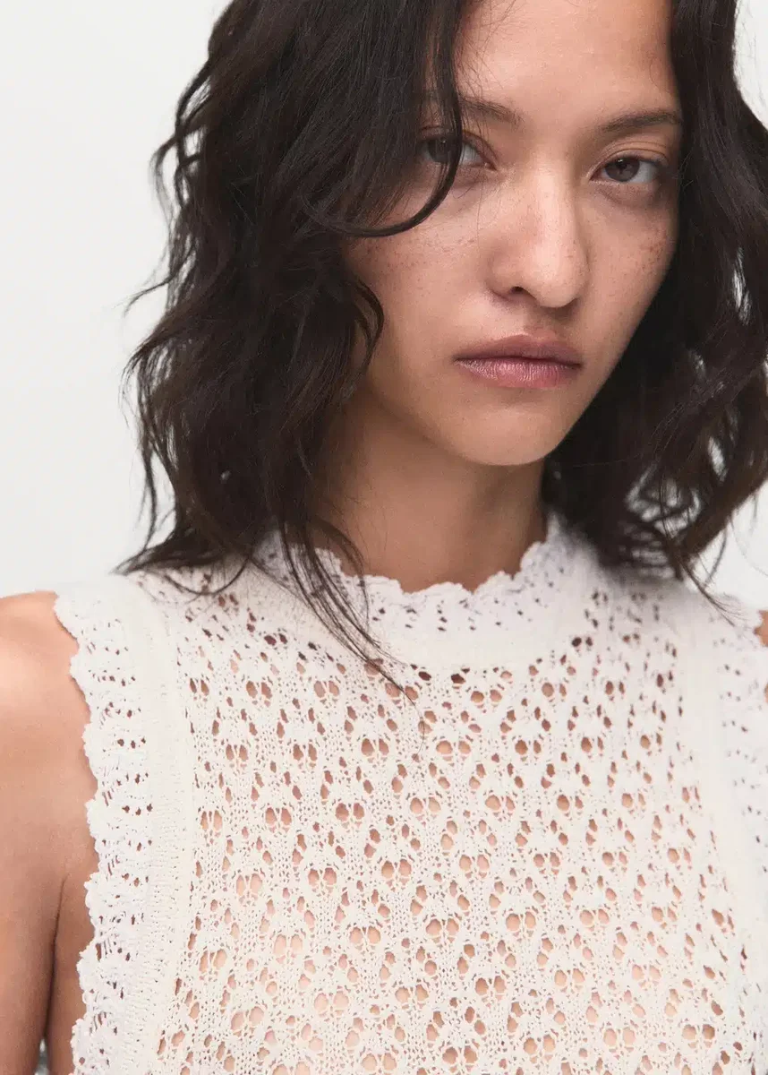 Středně silná pletenina. Průramkový úplet. Rovný střih. Kulatý výstřih. Široká ramínka. Bez zapínání