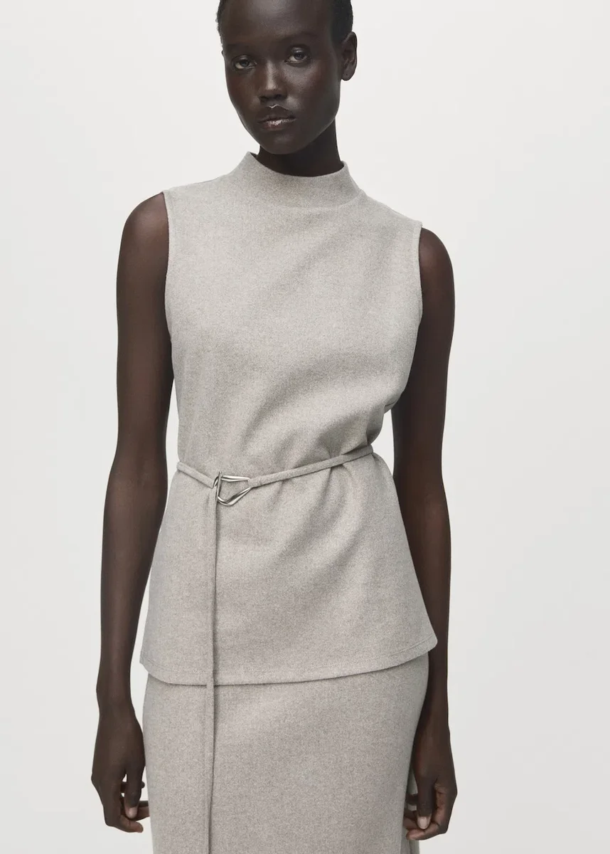 Rovný střih. Rolák. Bez rukávů. Široké ramínka. Ozdobný pásek