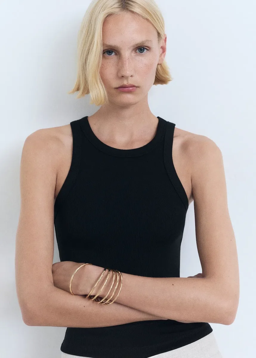 Tento přiléhavý model z žebrované látky má elegantní halter výstřih a široká ramínka. Bez rukávů a zapínání nabízí pohodlí a styl v jednom kuse. K dispozici v nadměrných velikostech