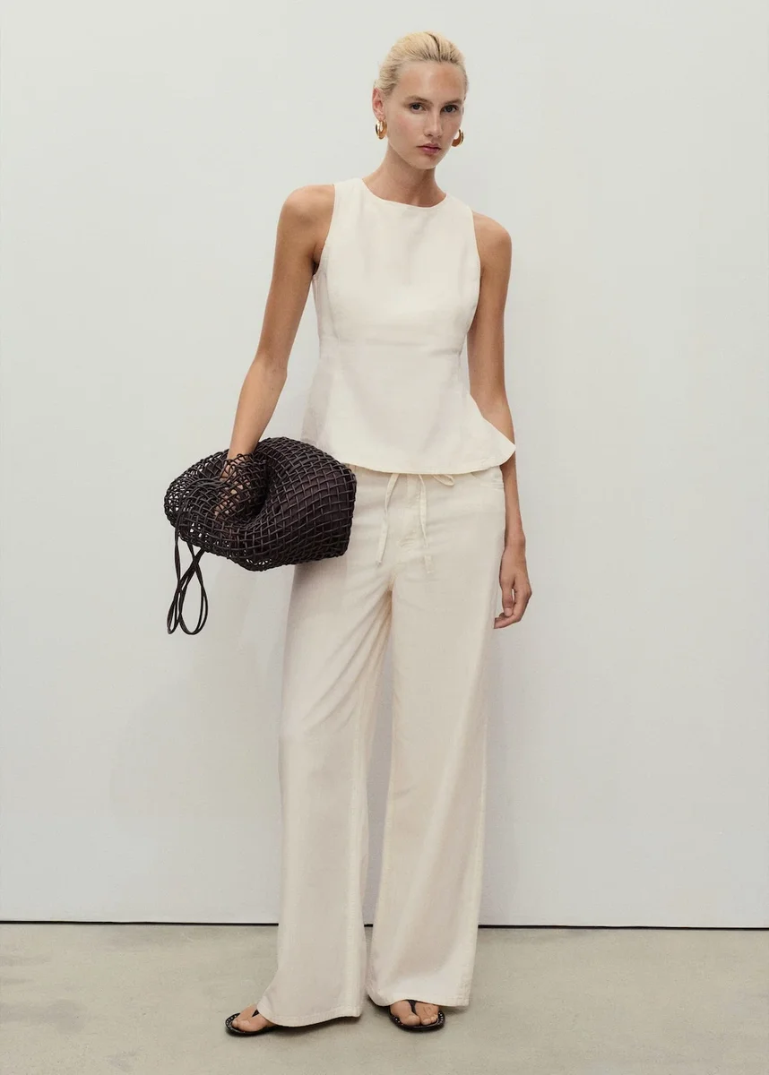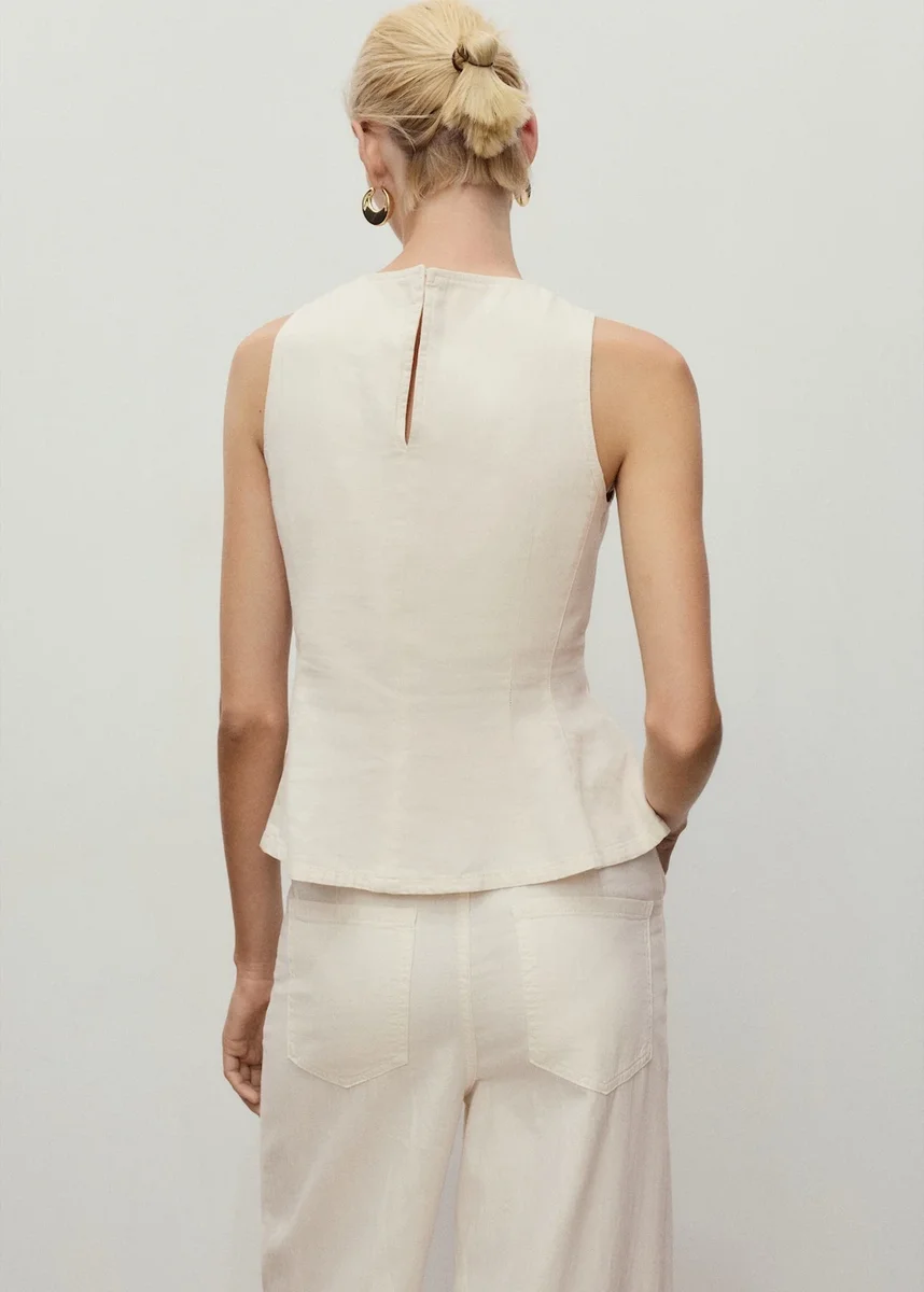 Tato bavlněná denimová halenka se vyznačuje minimalistickým designem. Kulatý výstřih a bezrukávový střih podtrhují jeho klasický střih. Horní část těsně přiléhá k trupu a mírně se rozšiřuje, čímž vytváří efekt áčkového střihu. K topu jsou navíc k dispozici kalhoty ve stejném stylu, které dotvářejí celkový denimový look.