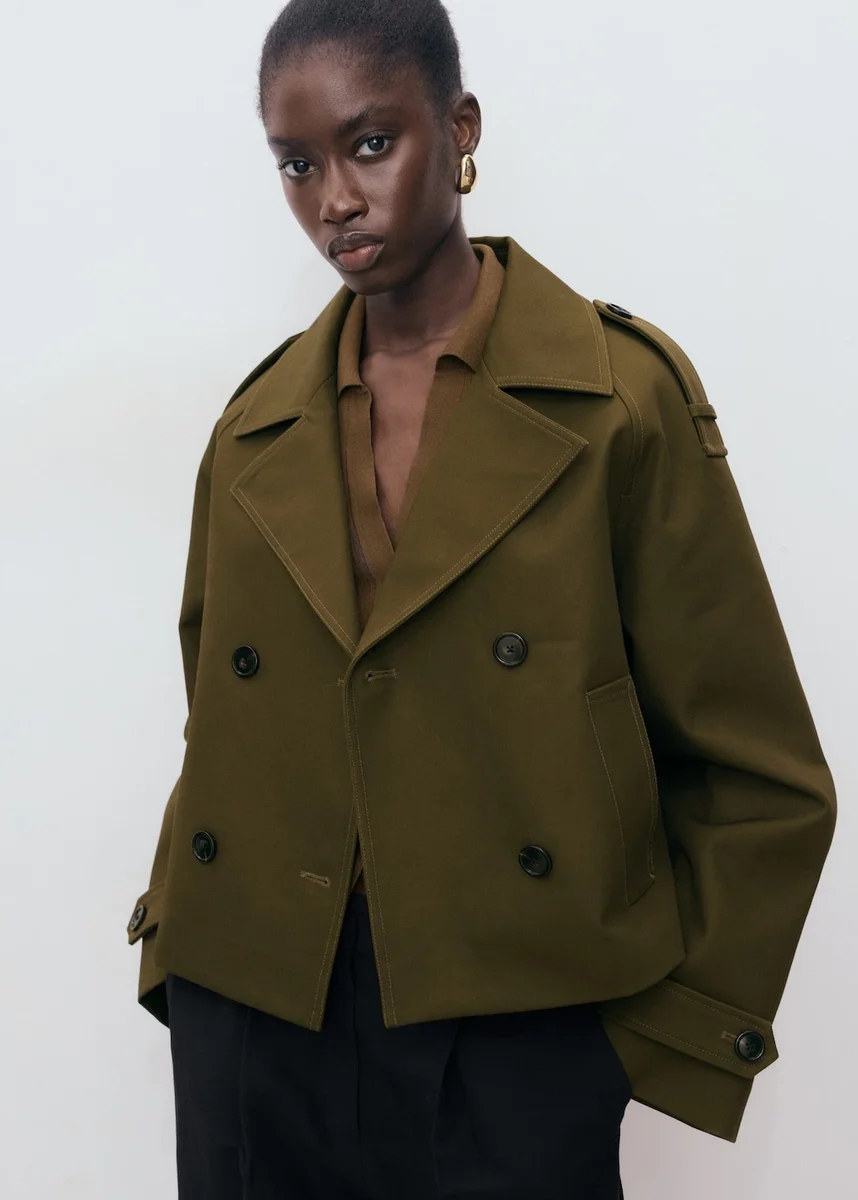 100 % bavlna. Krátký střih. Oversized střih. Límec s klopami a výstřihem do V. Klopy s výřezem. Dlouhé rukávy s manžetami na knoflíky. Poutka na ramenou. Dvě boční kapsy. Dvojité zapínání na knoflíky. Vnitřní podšívka