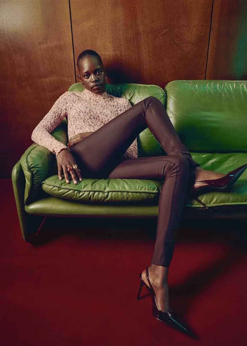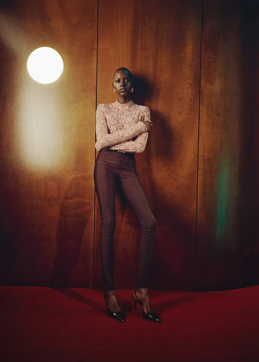 Tento oděv je vyroben z krajkové látky a má přiléhavý střih s rolákovým výstřihem a dlouhými rukávy.