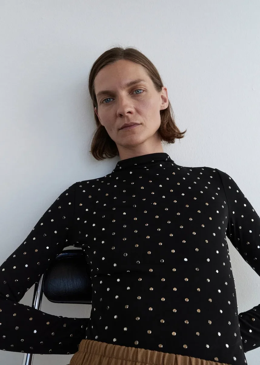 Tento přiléhavý model má elegantní lodičkový výstřih a dlouhé rukávy. Vyznačuje se krystalovou aplikací. Zapínání na knoflíky. Kolekce Selection.