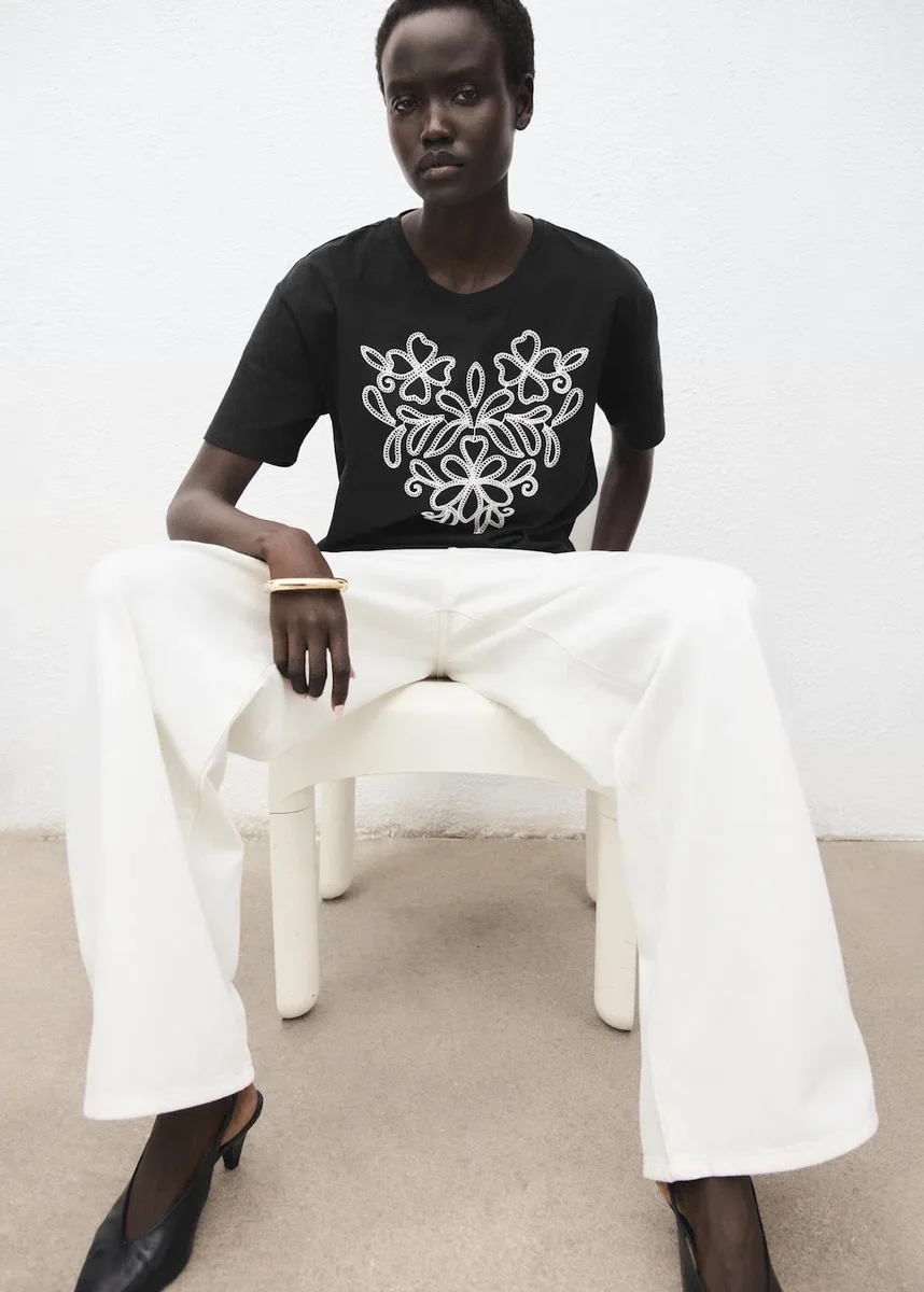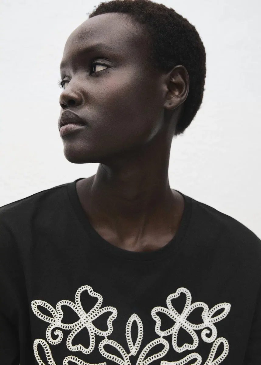 100% bavlna. Rovný střih. Květinová výšivka. Kulatý výstřih. Krátké rukávy. Bez zapínání