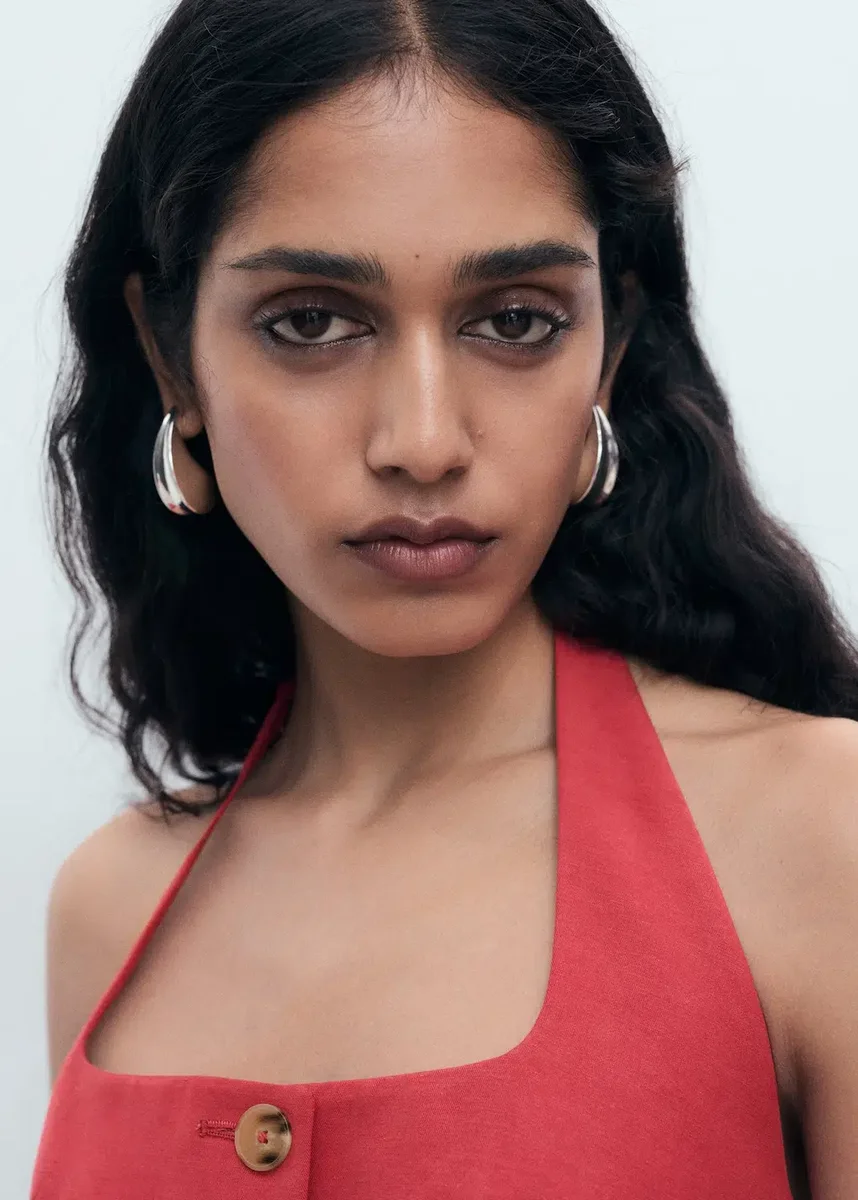 Směs lnu a lyocellu. Střih jako u kostýmu. Rovný střih. Hluboký výstřih. Halter výstřih. Dvě boční kapsy s klopami. Zapínání na knoflíky vpředu. Celkový vzhled. Červená barva je exkluzivně k dispozici online.