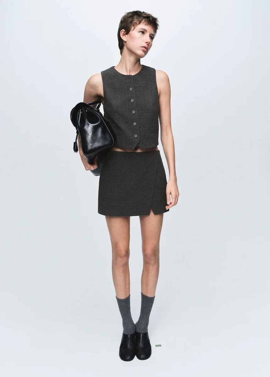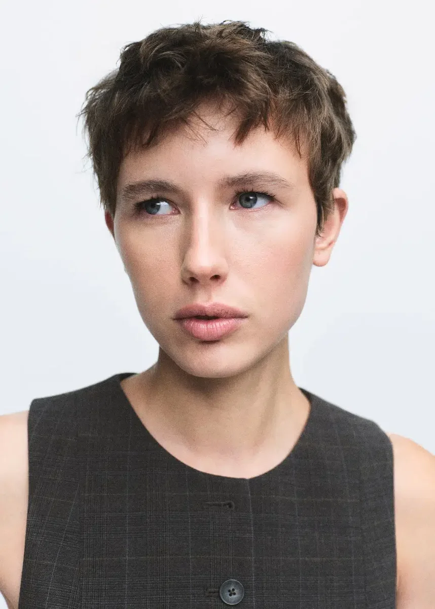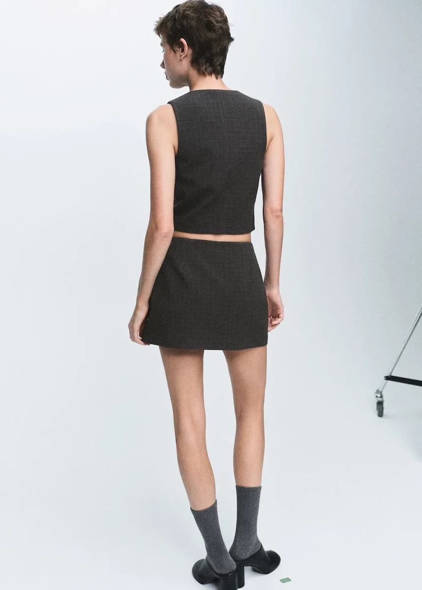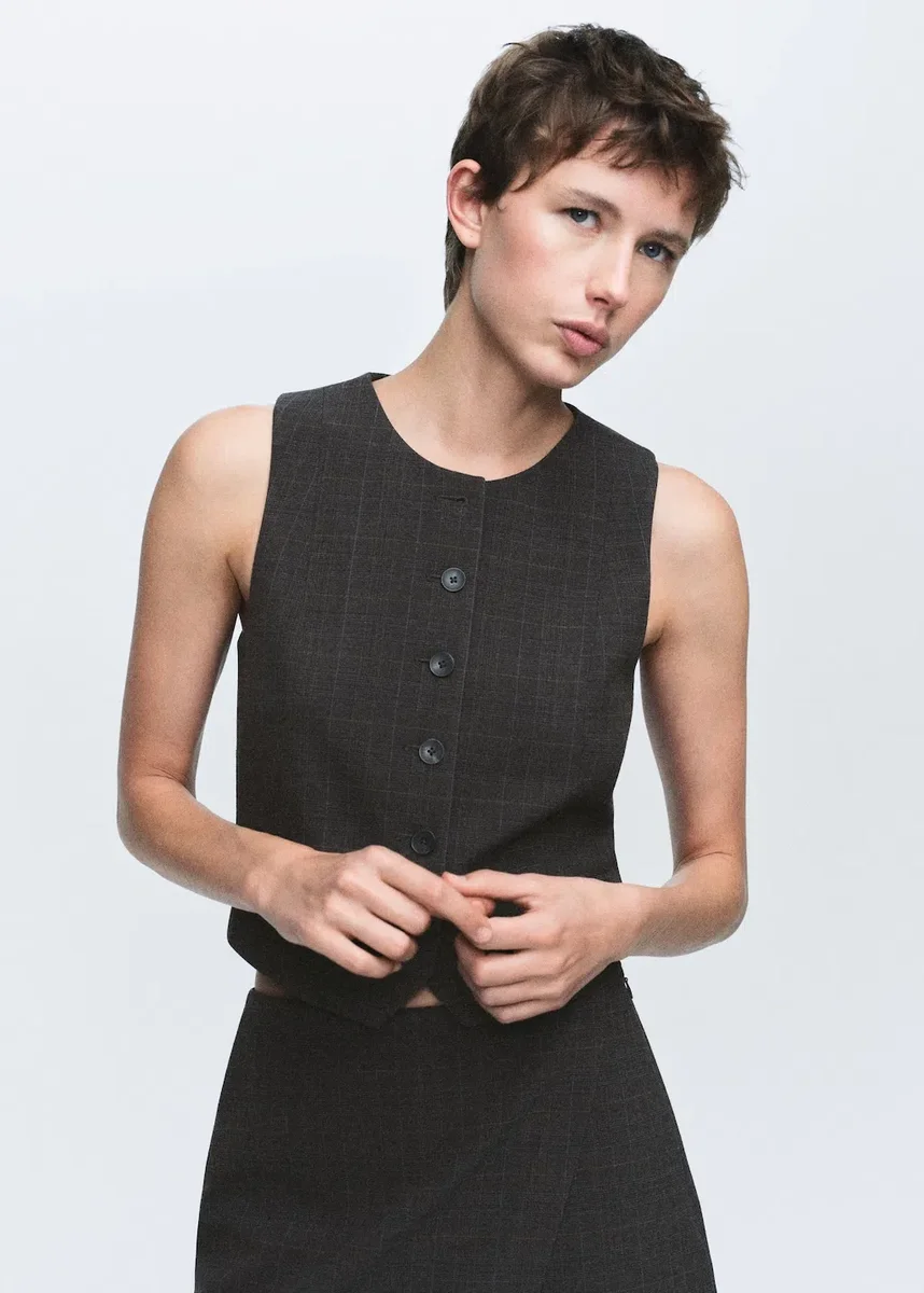 Rovný střih. Kostkovaný vzor. Kulatý výstřih. Bez rukávů. Zapínání na knoflíky vpředu.