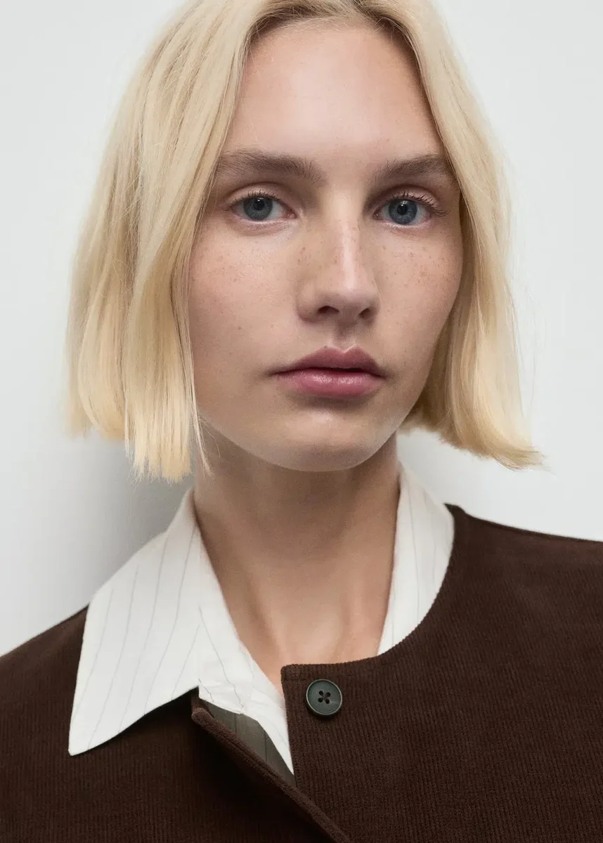 Tato rovná vesta z manšestru má kulatý výstřih a široká ramínka. Zapíná se na knoflíky vpředu. Součástí je i kalhoty ve stejném designu.