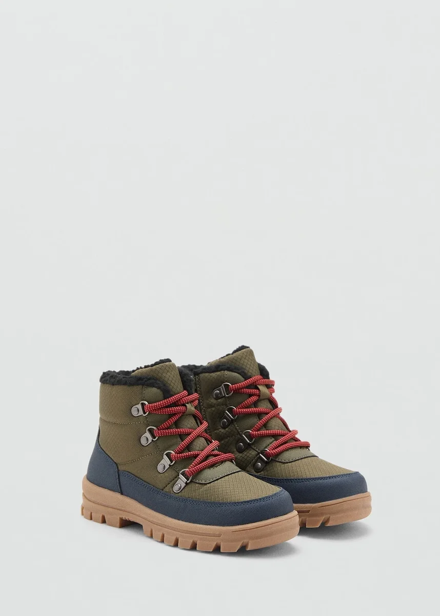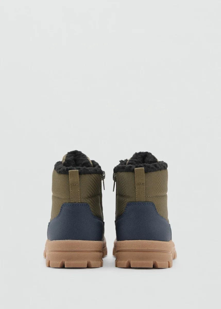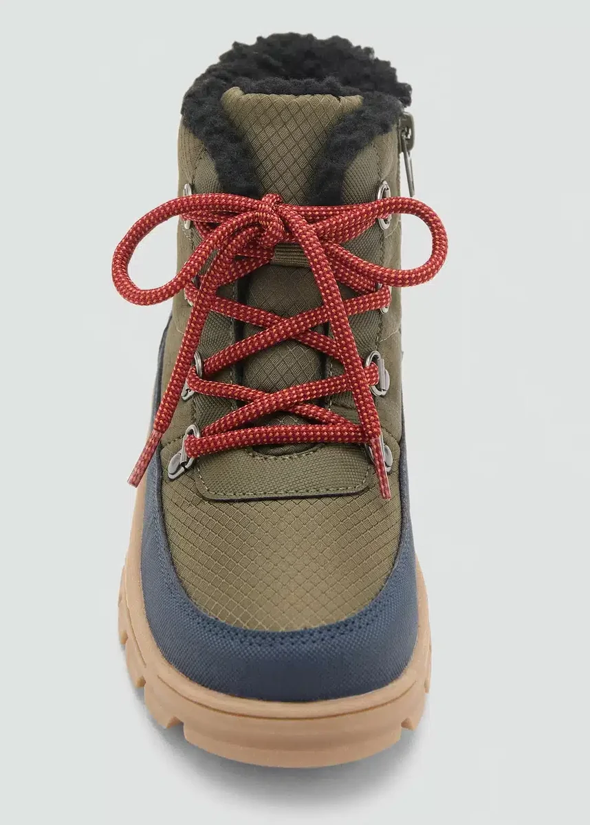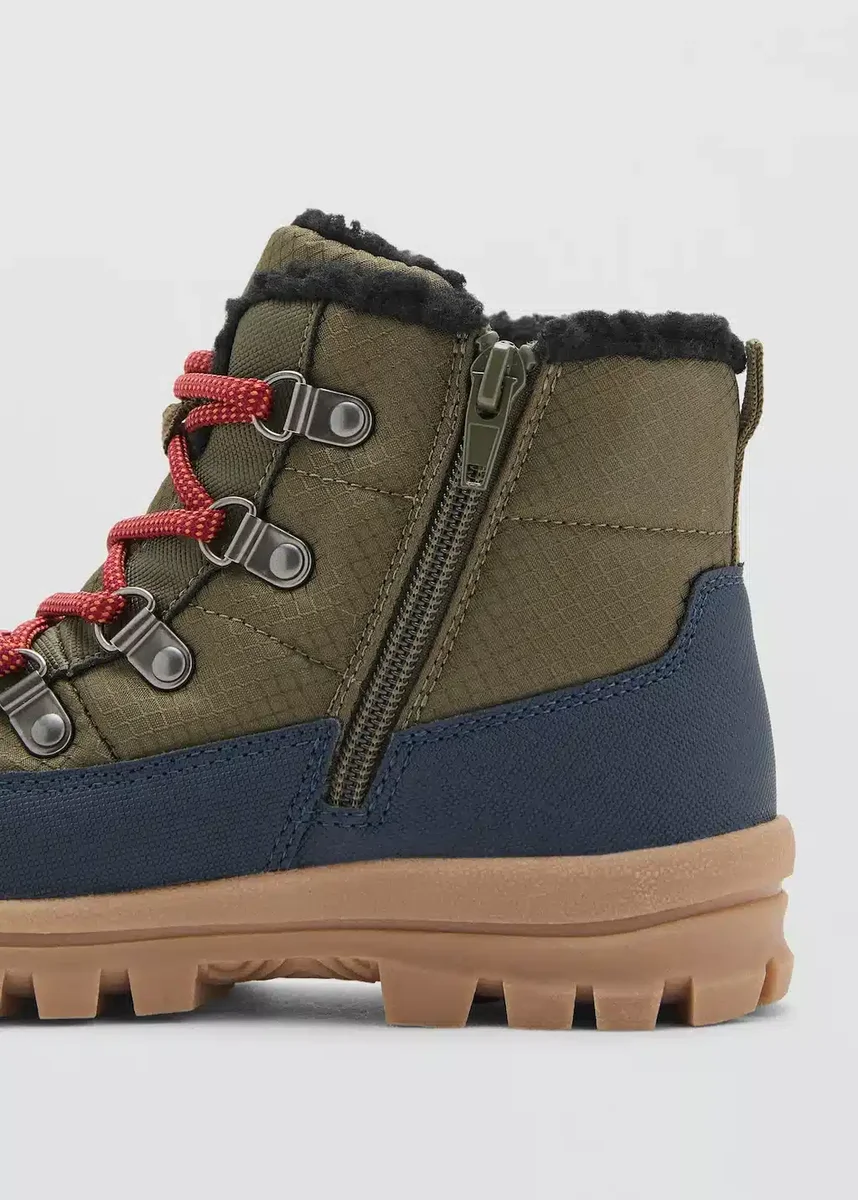 Polyesterová tkanina. Vnitřek z umělé ovčí kůže. Kulatá špička. Šněrovací detail. Boční zapínání na zip. Gumová podrážka.
